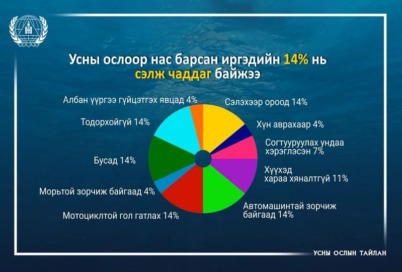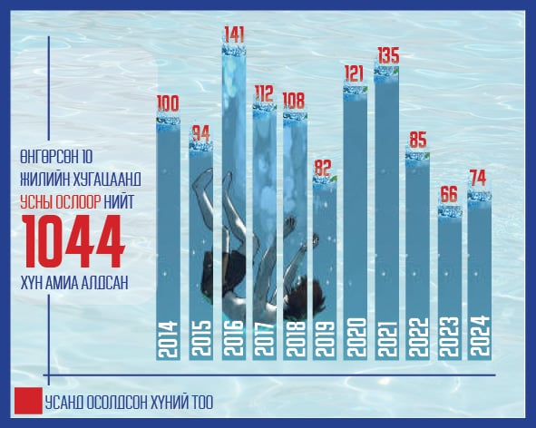 Мөн сүүлийн таван жилийн дунджийг харьцуулахад, наадмын амралтын өдрүүдэд усны ослоор 17 хүн амиа алддаг харамсалтай тоон үзүүлэлт гарчээ. Усанд живэхээс сэргийлэх дэлхийн өдөр өчигдөр буюу долдугаар сарын 25-нд тохиолоо. Усанд живсний улмаас дэлхийн хэмжээнд зургаан минут тутамд нэг, өдөрт 224, сард 6810 хүн, жилд 81,720 хүн амиа алдаж байна. Харин манайд жилд дунджаар 104 хүн амиа алдаж байгаа үзүүлэлт гарсан. Гуравхан сая хүн амтай улсад энэ бол том тоо.