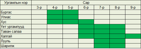 Зонхилох ургамлын тоосжилтын хуанли.
