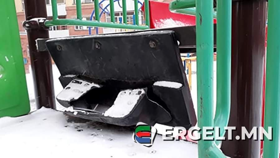 -Уг байрны гаднах талбайн гулсуур дамжих шат салсан харагдана. Мөн тус шатны доор байрлах хүүхдийн жижиг савлуур нь гагнаасаараа салж, унжсан байдалтай байв.