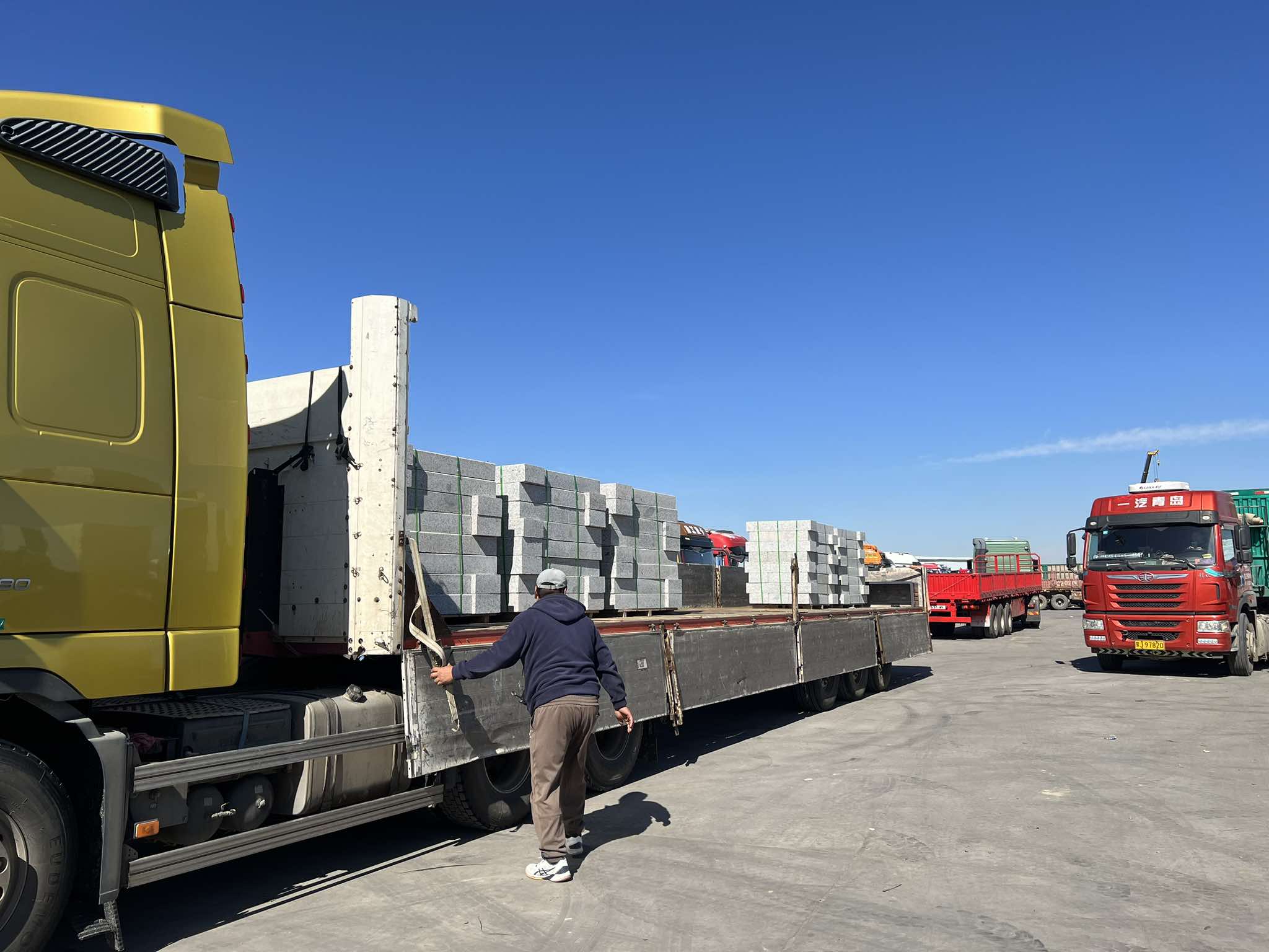Энэ ачаа өнөөдөр (есдүгээр сарын 15)-ийн сүүлийнх гэнэ. Өнөөдөр нийтдээ 14 машин гаалийн хашаагаар гарах “үүрэгтэй” байгаа гэнэ. Сүүлийн зургаа нь ачигдаж байгаа нь энэ. Гаалийн хашаагаар орж ирсэн бордюр ачсан машиныг ачааны эзэд тосож аваад, энд, тэндгүй хаазлах машины чимээнээс давж ярихын тулд хашхиралдаад, хуруу, гараараа заагаад арайчүү байрлуулав. Тэгээд 32 ширхгийг найман эгнээр багцалж боосон бордюрыг монгол жолооч нарт хүлээлгэн өгөөд, ачиж эхэллээ. Ачааны зориулалттай жижиг техникээр яах ийхийн зуургүй зөөж, эхний машинаа суллаад гаргав.