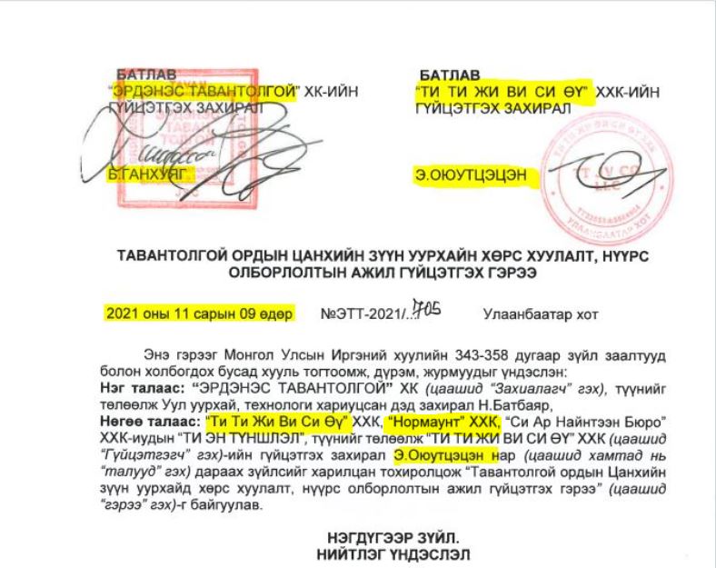 3. NORINCO: “NORINCO GROUP” КОМПАНИЙН ОХИН КОМПАНИ “НОРМАУНТ” ХХК БОЛОН “ТИ ТИ ЖИ ВИ СИ ӨҮ” ХХК-ИЙН 2.2 ИХ НАЯД ТӨГРӨГИЙН ГЭРЭЭ- ТАВАНТОЛГОЙ ОРДЫН ЦАНХИЙН ЗҮҮН УУРХАЙД ОЛБОРЛОЛТ ХИЙХ