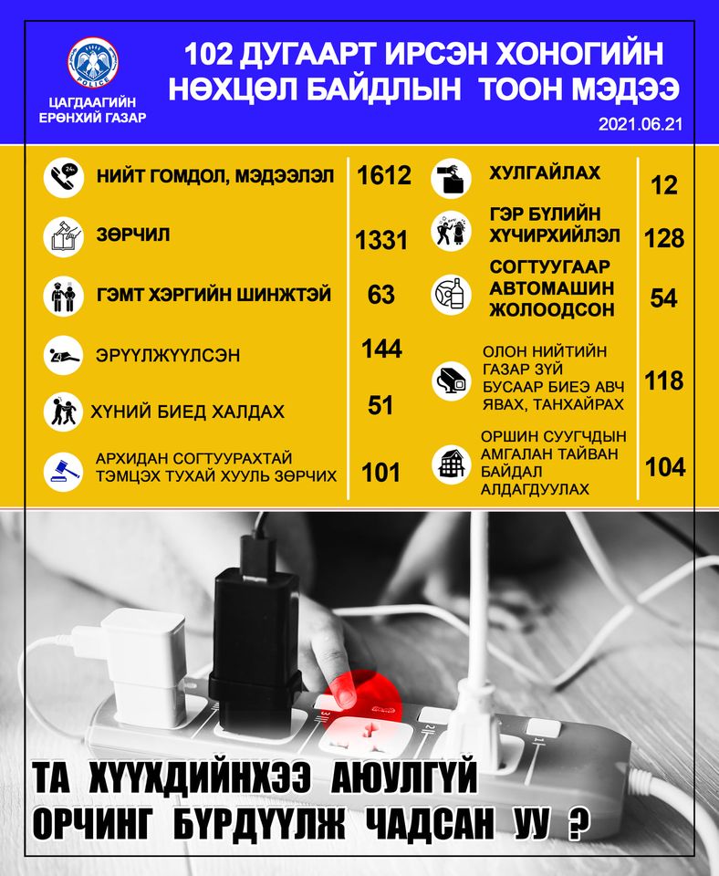 Цагдаагийн байгууллагад өчигдөр 1662 дуудлага, мэдээлэл бүртгэгджээ. Бүртгэгдсэн дуудлагын 1331 нь зөрчлийн шинжтэй, 63 нь гэмт хэргийн шинжтэй дуудлага байсан аж. Үүнээс гэр бүлийн хүчирхийллийн дуудлага 128 бүртгэгджээ. Мөн согтууруулах ундаа хэрэглэсэн үедээ автомашин жолоодсон 54 хүн байсан бөгөөд 144 хүнийг эрүүлжүүлжээ. Түүнчлэн Архидан согтуурахтай тэмцэх тухай хууль зөрчсөн тухай 101 дуудлага ирсэн байна. Үүнээс гадна, олон нийтийн газар зүй бусаар биеэ авч яван, танхайрсан тухай 118, оршин суугчдын амгалан тайван байдал алдагдуулсан 104, хүний биед зүй бусаар халдсан тухай 51 дуудлага ирсэн бөгөөд хулгайн гэмт хэрэг 12 бүтгэгджээ.