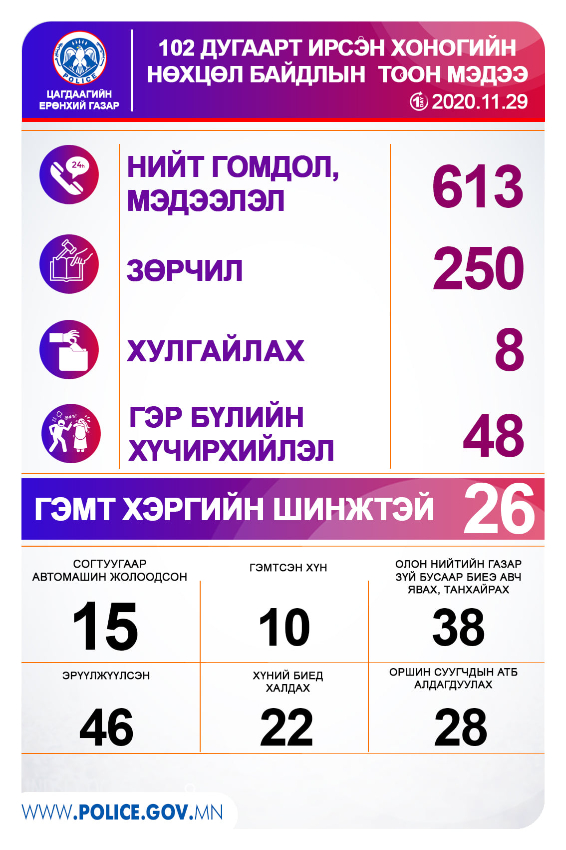 Цагдаагийн байгууллагад өчигдөр буюу арваннэгдүгээр сарын 29-нд нийтдээ 613 гомдол, мэдээлэл иржээ. Нийт дуудлагын 250 нь зөрчлийнх, найм нь хулгайлах, 48 нь гэр бүлийн хүчирхийлэлийн дуудлага ирсэн байна. Харин гэмт хэргийн шинжтэй 26 дуудлага ирсэн байна.