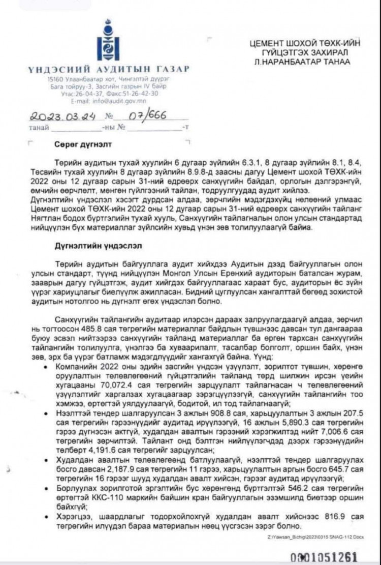 ТӨБЗГ-ын дарга Б.Цэнгэл өчигдөр "Цемент шохой" ТӨХК-ийн гүйцэтгэх захирал Л.Наранбаатар болон тус компанийг ТУЗ-ийн гишүүдийг албан тушаалаас нь чөлөөлөхөөр болсноо зарласан. Тэгвэл үргэлжлүүлэн өнөөдөр хууль хяналтын байгууллагын мөрдөгчид Л.Наранбаатарын түрээсэлдэг орон сууц, "Цемент шохой" ТӨХК-ийн оффис дахь албан өрөөнд нь нэгжлэг хийж байгаа аж.