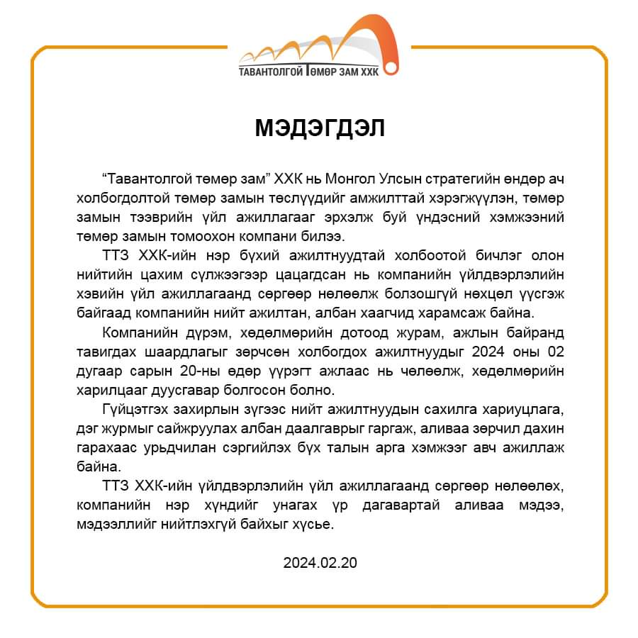“Тавантолгой төмөр зам” ХХК-ийн нэр бүхий удирдлагуудын ёс зүйгүй үйлдэл бүхий бичлэг олон нийтийн сүлжээгээр цацагдсан. Тэгвэл “Тавантолгой төмөр зам” ХХК-иас мэдэгдэл гаргажээ. Тодруулбал, “Тавантолгой төмөр зам” ХХК-ийн нэр бүхий ажилтнуудтай холбоотой бичлэг олон нийтийн цахим сүлжээгээр цацагдсан нь компанийн үйлдвэрлэлийн хэвийн үйл ажиллагаанд сөргөөр нөлөөлж болзошгүй нөхцөл үүсгэж байгаад компанийн нийт ажилтан, албан хаагчид харамсаж байна. Компанийн дүрэм, хөдөлмөрийн дотоод журам, ажлын байранд тавигдсан шаардлагыг зөрчсөн холбогдох ажилтнуудыг өнөөдөр үүрэгт ажлаас нь чөлөөлж, хөдөлмөрийн харилцааг дуусгавар болгосон болно. Гүйцэтгэх захирлын зүгээс нийт ажилтнуудын сахилга, хариуцлага, дэг журмыг сайжруулах албан даалгаврыг гаргаж, аливаа зөрчил дахин гаргахаас урьдчилан сэргийлэх бүх талын арга хэмжээг авч ажиллаж байна” гэжээ.