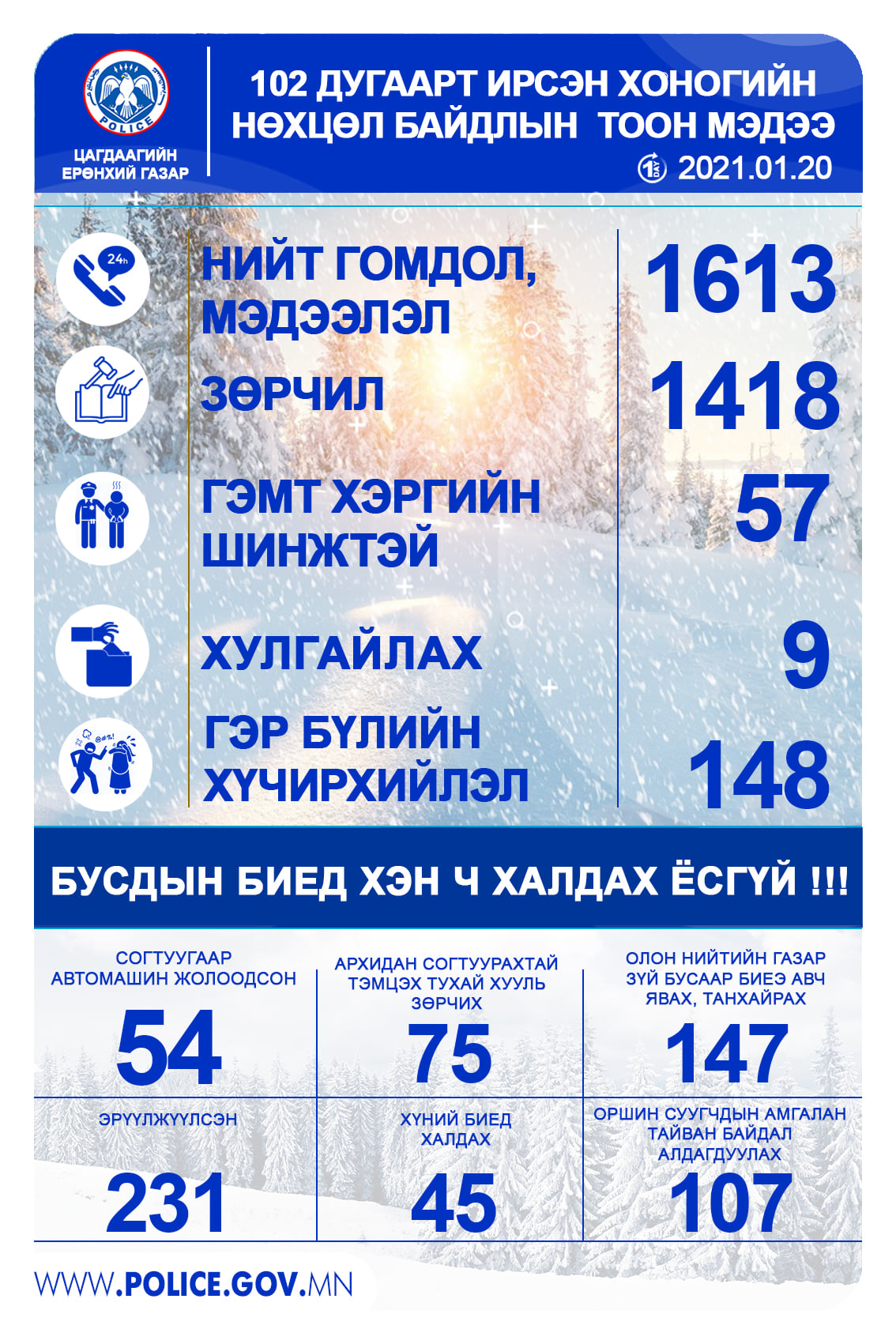 ЦЕГ-ын 102 дугаарын утсанд өчигдөр 1613 дуудлага бүртгэгджээ. Тодруулбал, нийт дуудлагын 1418 нь зөрчлийнх, 57 нь гэмт хэргийн шинжтэй байсан аж. Мөн гэр бүлийн хүчирхийллийн 148 дуудлага ирсэн бол хулгайлах төрлийн есөн дуудлага бүртгэгдсэн байна. Түүнчлэн 231 хүн эрүүлжүүлэгдэж, 54 хүн согтуугаар тээврийн хэрэгсэл жолоодсон зөрчил гаргажээ. Үүнээс гадна олон нийтийн газарт биеэ авч явах, танхайрах 147, оршин суугчдын амгалан тайван байдал алдагдуулсан 107, хүний биед халдах 45 дуудлага ирсэн байна.