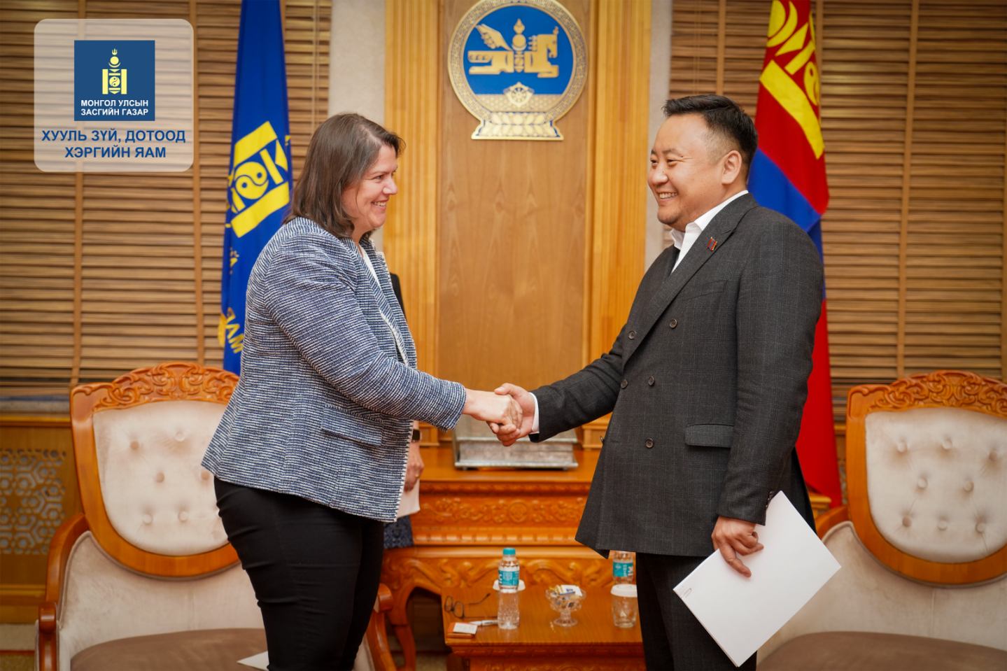 Хууль зүй, дотоод хэргийн сайд О.Алтангэрэл Канад Улсаас Монгол Улсад суугаа Онц бөгөөд Бүрэн эрхт Элчин сайд Сандра Шуфанийг өнөөдөр (2025.05.06) хүлээн авч уулзлаа. Уулзалтын эхэнд, Хууль зүй, дотоод хэргийн сайд О.Алтангэрэл Монгол, Канадын харилцаа, хамтын ажиллагаа ардчилал, хүний эрх, эрх чөлөө, хууль дээдлэх зарчим, жендэрийн эрх тэгш байдлыг эрхэмлэсэн нийтлэг үнэт зүйлсэд тулгуурлан хоёр улсын харилцааг Иж бүрэн түншлэлийн түвшинд хүргэж, шат ахиулж буйд талархал илэрхийлсэн.Хатагтай Сандра Шуфани Канад Улсын Засгийн газрын санхүүжилтээр бусад улс оронд хэрэгжүүлж буй төсөл хөтөлбөрийн талаар дэлгэрэнгүй мэдээлэл өглөө. Улмаар Олон улсын эрх зүйн хөгжлийн байгууллагаас хэрэгжүүлж байгаа “Монгол Улсад жендэрт суурилсан хүчирхийлэлтэй тэмцэх үйл ажиллагааг бэхжүүлэх нь” төслийн нэгдүгээр үе шатыг 2019-2023 онд амжилттай хэрэгжүүлж, гэр бүлийн хүчирхийллийн гэмт хэргийн хохирогчдын эрхийг хамгаалах хууль, эрх зүйн орчин болоод туслалцаа үйлчилгээ үзүүлэх боломжоор хангаж, анхаарч ажилласан ХЗДХЯ-ны удирдлагын бүрэлдэхүүнд талархсанаа илэрхийллээ.Төслийн 2-р шатыг “Монгол Улсад жендэрт суурилсан хүчирхийлэлтэй тэмцэх үйл ажиллагааг бэхжүүлэх нь 2025-2030” нэртэйгээр энэ оны 6-р сард багтааж эхлүүлэх талаар Элчин сайд мэдэгдсэн. Улмаар талууд төслийн 2-р үе шатыг хэрэгжүүлэх үйл ажиллагаа болон салбарын бусад асуудлаар нээлттэй санал солилцлоо.Уулзалтад ХЗДХЯ-ны Олон улсын гэрээ, гадаад хамтын ажиллагааны газрын дарга Ч.Нарантуяа, Хууль зүйн бодлогын газрын Хувийн эрх зүйн Хэлтсийн даргын албан үүргийг түр орлон гүйцэтгэгч О.Оюунзул, Монгол Улс дахь Канад Улсын Элчин сайдын яамны Хөгжлийн хамтын ажиллагааны дарга Кирил Лорданов нарын төлөөлөл байлцлаа.
