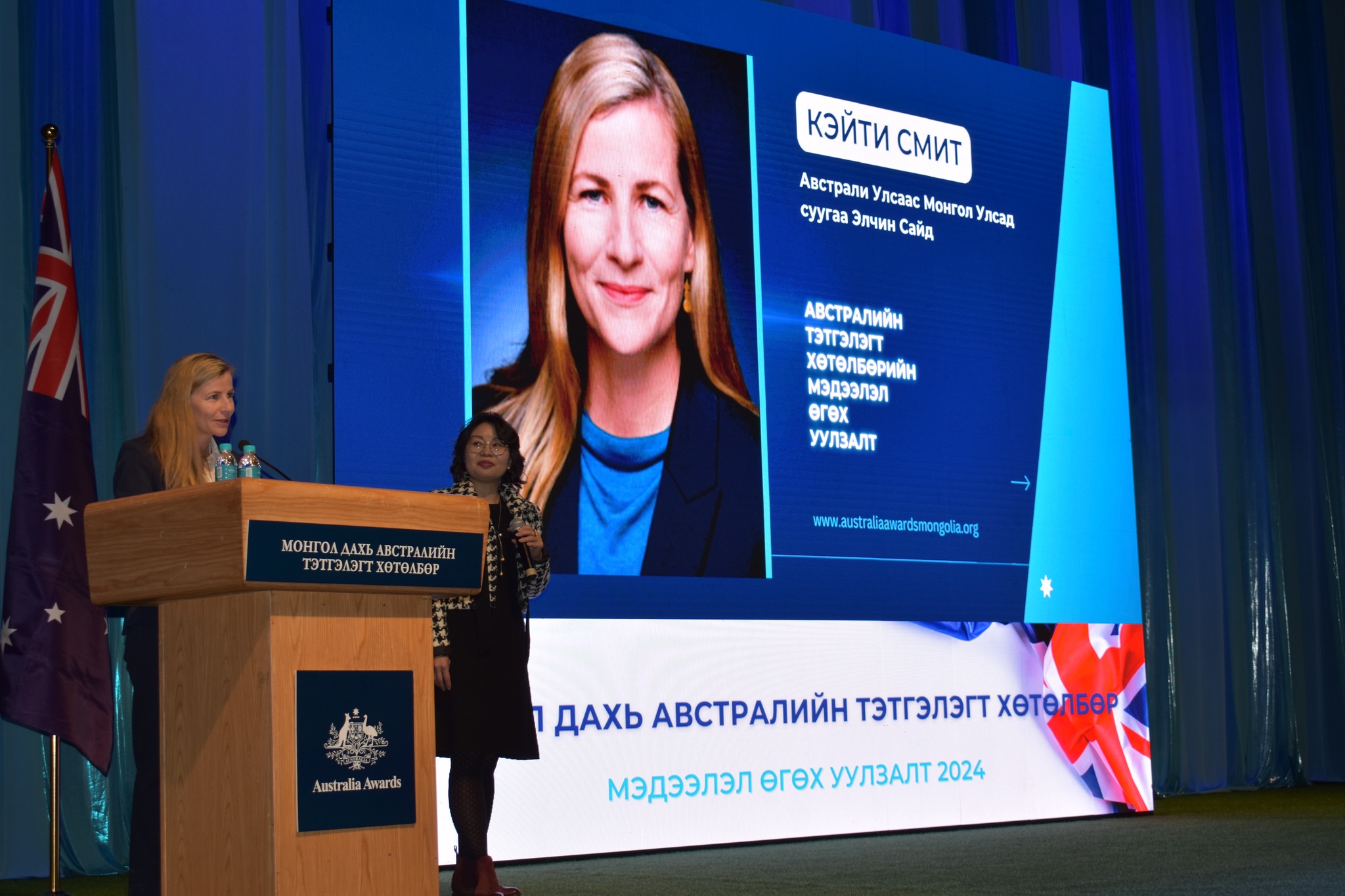 Австралийн Холбооны Улсаас Монгол Улсад суух Онц бөгөөд Бүрэн эрхт Элчин сайд Кэйти Смит Лондонгийн засгийн сургууль, Нью Саут Уэльсийн их сургуульд зэрэг хамгаалсан хүмүүнлэг, шинжлэх ухааны магистр. Тэрбээр уг албанд томилогдохоосоо өмнө Австрали Улсын Гадаад харилцаа, худалдааны яамны Номхон далай хэсгийн даргын ахлах зөвлөхөөс эхлээд Лаос, Индонези Австралийн Элчин сайдын яамны нэгдүгээр нарийн бичгийн даргаар ажиллаж байжээ.