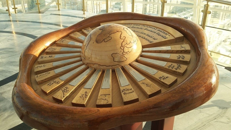Бөмбөрцгөөс холгүй Ерөнхийлөгч Нурсултан Назарбаевын баруун гарын алганы алтан хэв агуулсан “Аялы алакан” хэмээх үзмэр байна. Казахаас нь үгчлэн орчуулбал “Бүхний төлөөх алга” гэсэн утгатай юм байх. Алтан хэвэнд цутгасан энэ алга, энэ гараараа Эрхэм Ерөнхийлөгч нь казах түмнийхээ төлөө зүтгэн хөдөлмөрлөсөн гэдгийг илэрхийлдэг чухал үзмэр гэж хөтөч бүсгүй тайлбарлаж байна лээ. Казах түмэн нь Ерөнхийлөгчийнхөө алганы энэ алтан хэвд өөрийн алгыг тавьж хүсэл мөрөөдлөө шивнэвэл тэр нь биелэх нигууртай гэж бас итгэн сүсэглэцгээдэг гэх.