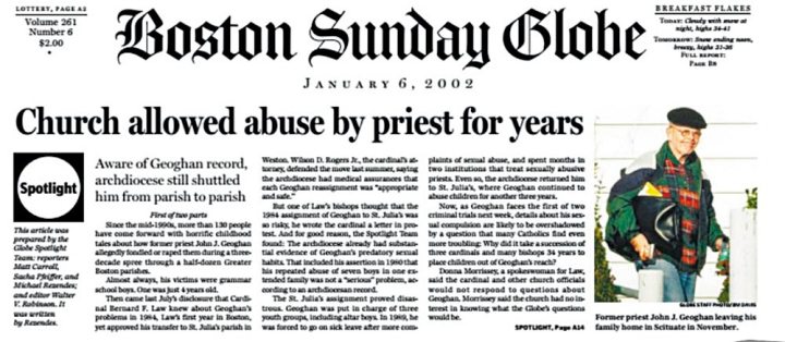 Энэхүү нийтлэлийг "Boston Globe" сонины "Spotlight" багийнхан сүмийн санваартан насанд хүрээгүй хүүхдийг хүчирхийлж буй хэргийн талаар сурвалжилж 2002 онд олон нийтэд ил болгож байжээ. Тус багийнхан эрэн сурвалжлах эл нийтлэлээр Пулицерийн шагнал авсан бөгөөд 2015 онд "Spotlight" нэртэй хэргийн талаар кино хийгдэж, Оскарын Гран При шагналыг хүртэж байлаа. Уг нийтлэлийг хөрвүүлэн хүргэж байна.