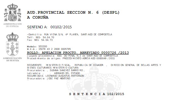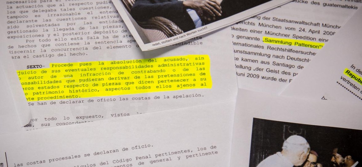 Леонардо Паттерсонд холбогдох хавтаст хэргийг Лима дахь шүүхийн архивт хадгалсан байдаг. Уг нь Паттерсонд 45 дахь мужийн Эрүүгийн прокуророос хууль бусаар соёлын олдворын худалдаа эрхэлсэн, иргэдэд 300 мянга гаруй ам.доллартой тэмцэх хохирол учруулсан хэрэгт гэм буруутай гэж үзэн таван жилийн хорих ял оноохыг санал болгожээ. Гэвч энэ хүсэлт зогсонги байдалд байсаар дахин сөхөгдөөгүй юм. Мөн үүнтэй холбоотойгоор төрийн алба хаагч, дипломатч нарыг шалгах болсон аж. Улмаар 2001 онд Перугийн дипломатя Делиа Подеста Куадрос Колумбын үеэс өмнө соёлын олдворыг хууль бусаар хил дамнуулах гэж байгаад баривчлагдсан. Делиа Подеста Куадрос уг хэргээ Леонардо Паттерсонтой холбон тайлбарласан мэдүүлэг өгсөн гэдэг. Мөн Паттерсоны цуглуулгаас Гватемал Улс Маяагийн үед хамаарах 369 археологийн үнэт зүйлээ эргүүлэн авах оролдлого хийсээр байсан. Харин тус хэргийн гол прокурор Роландо Роденас “Гватемалл Улс Герман Улсаас тавьсан шаардлагыг хангаагүй тул хэргийг архивлана” хэмээн мэдэгджээ. Археологийн олдворуудад бүрэн бүртгэл хийж, мэдээлээгүйн улмаас дээрх шийдвэрт хүргэсэн аж. Харин Эквадор Улс археологи, Палентеологийн олдвороо эргүүлэн авах хүсэлт гаргаж байсан ч тус хүсэлтээ эргүүлэн татсан байдаг.