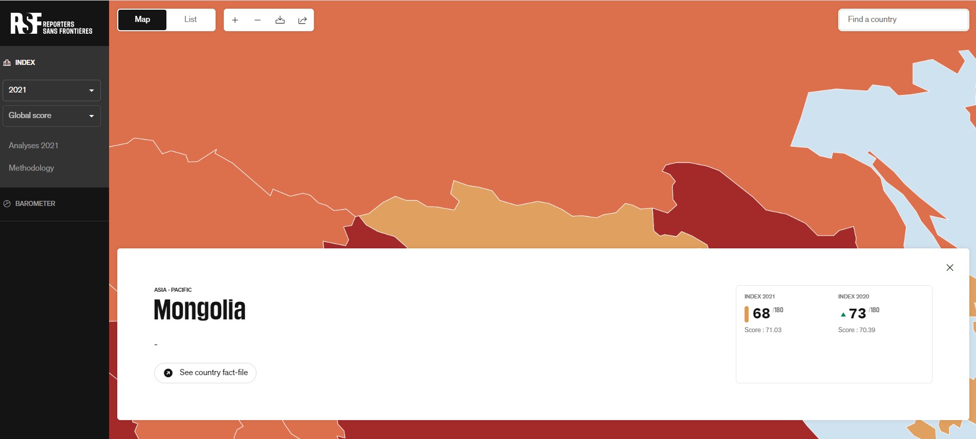 | Монгол Улс хэвлэлийн эрх чөлөөний индекст 68 дугаар байрт жагсаж байна |