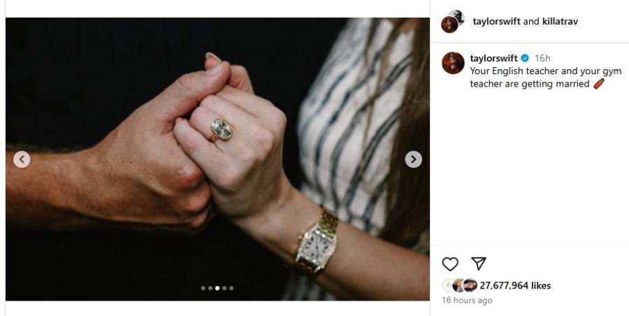“Таны англи хэлний багш, биеийн тамирын багш хоёр гэрлэх гэж байна” хэмээн бичиж, гэрлэх саналыг хүлээн авч буйгаа баталсан гэрэл зургуудыг нийтэлжээ. Түүний хуримын бөгжийг Artifex Fine Jewellery компанийн загвар зохион бүтээгч Киндред Любек урлажээ. Дуучин Avril Ramona Lavigne, супермодель Cara Delevingne зэрэг олон алдартнууд Инстаграм хуудсаараа дамжуулан баяр хүргэсэн бол АНУ-ын Ерөнхийлөгч Donald Trump “Амжилт хүсье. Тэр үнэхээр гайхалтай тоглогч, гайхалтай залуу. Харин Taylor swift бол үнэхээр гайхалтай хүн гэж бодож байна” хэмээжээ.