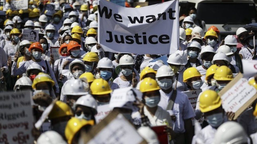Мьянмарт цэргийнхэнтэй "гар нийлье" гэсэн уриалгыг эсэргүүцэн, төрийн эргэлт хийсэнд бухимдлаа илэрхийлж олон нийт ахин жагсаж байна. Үндэстний эвлэлийн баярын өдөр генерал Мин Аун Хлаинг олон нийт задрахаас сэргийлэн эв нэгдэлтэй байхыг уриалжээ. Гэвч баярын өдөр Аун Сан Су Чи-г суллахыг шаардаж олон нийт жагссаар байв. Энэ үеэр Мавламин хотод цагдаа нар жагсагчид руу резинэн сумаар буудсан гэв.