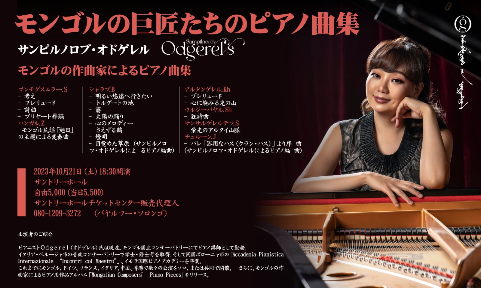 -Тиймээ, Япон Улсын Токиогийн Сантори Холлын 400 гаруй хүний суудалтай цэнхэр сарнай танхимд Монголын хөгжмийн зохиолчдын төгөлдөр хуурт зориулсан бүтээл анх удаа тоглох болсноороо онцлогтой. Мэдээж манай улсын төгөлдөр хуурчдаас Японд тоглож байсан ч монгол хөгжмөөр дагнасан тоглолт болж байгаагүй. Миний хувьд Италид есөн жил сураад, сургуулиа төгсөж эх орондоо ирээд хамгийн түрүүнд “Монголын хөгжмийн зохиолчдын төгөлдөр хуурт зориулсан бүтээлүүд” гэх цомог гаргасан. Нэг ёсондоо монгол хөгжмийн зохиолчдынхоо бүтээлээр дагнах хүсэл сонирхолдоо хөтлөгдөн энэ удаагийн тоглолтынхоо хоёрдугаар хэсэгт монгол бүтээлээсээ тоглосон. Энэ нь давхар Японд тоглох тоглолтын бэлтгэл болсон.
