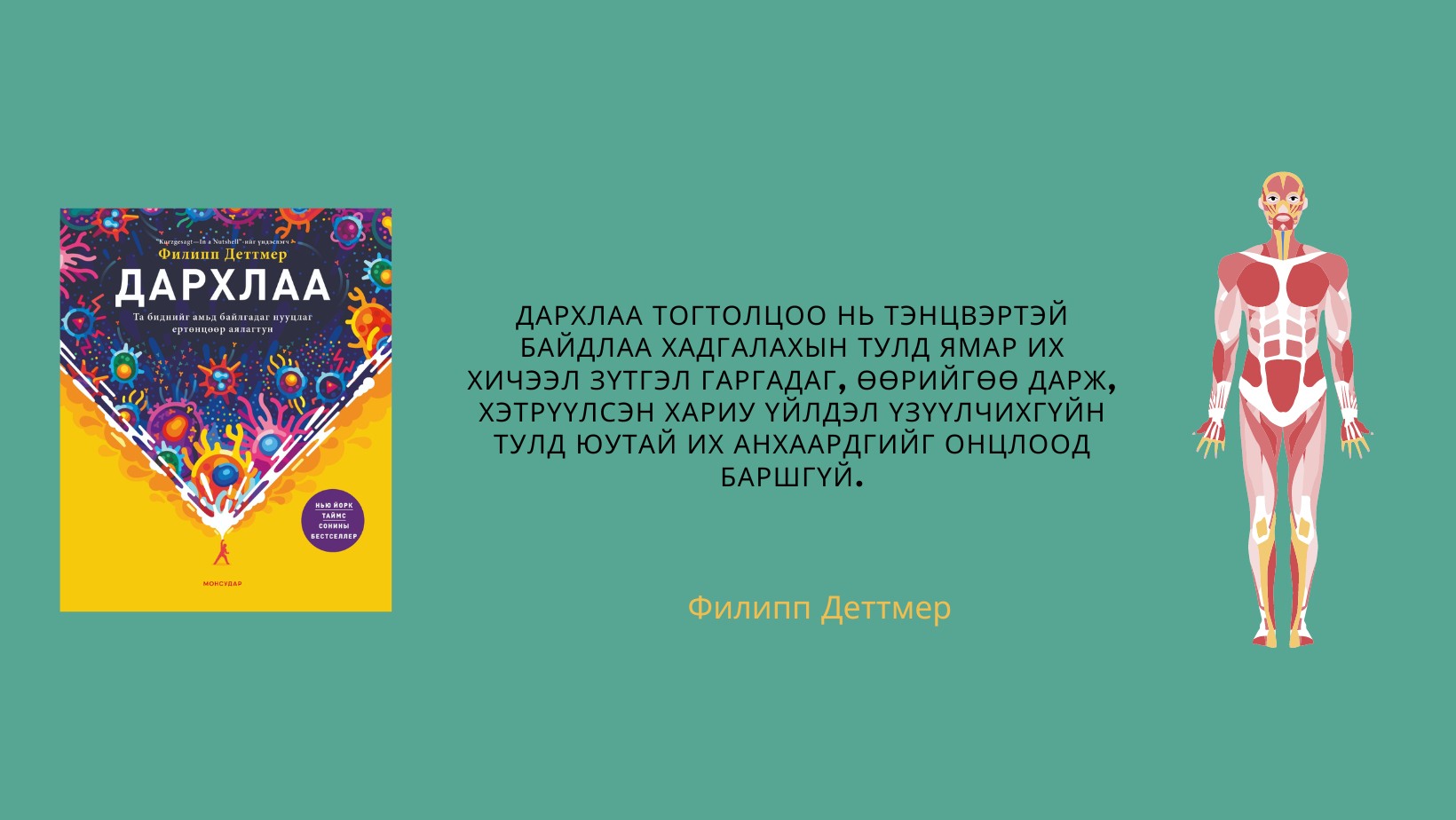 Иймээс л өөрт хэрэгтэй, чухалчлан авч үзэх зүйлсээ Деттмерийн “Дархлаа” номтой танилцаж сонгох нь ухаалаг алхам болно. Учир нь дархлаа тогтолцоог идэвхжүүлэхэд энгийн хүмүүст зөв амьдралын хэв маяг л туйлын чухал ажээ.