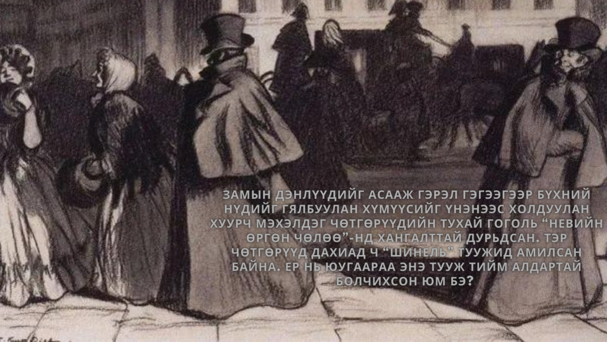 Харин одоо эргээд “Шинель”-рүүгээ оръё доо. Замын дэнлүүдийг асааж гэрэл гэгээгээр бүхний нүдийг гялбуулан хүмүүсийг үнэнээс холдуулан хуурч мэхэлдэг чөтгөрүүдийн тухай Гоголь “Невийн өргөн чөлөө”-нд хангалттай дурьдсан. Тэр чөтгөрүүд дахиад ч “Шинель” туужид амилсан байна. Ер нь юугаараа энэ тууж тийм алдартай болчихсон юм бэ? Энгийн л нэг амьдралын цаана ямар чөтгөр нуугдан суучихаад биднийг шоолон байгааг хүмүүст хэлж өгснөөрөө тэр үү! Эсвэл зүгээр л туужийн төгсгөлийн хэдэн цогцолборт өгүүлэгдэх Акакий Акакиевич сүнс болчихоод Калинкины гүүрийн ойролцоо хэрэн тэнүүчлэх болж, Петербург даяар алдаршиж байгаа нь уншигчдыг гайхшруулдаг гэж үү! Нөгөө талаар яг л энд үнэ цэнэ байгаа юм шиг санагдана. “Гэвч Акакий Акакиевичийн түүх ингээд дуусахгүй. Акакий Акакиевич хэний ч анхаарлыг таталгүй амьдарсныхаа шанд үхсэн хойноо хэдэн хоногийн турш шуугиан дэгдээх учиртай байсан гэж хэн зүүдлэх вэ дээ.”