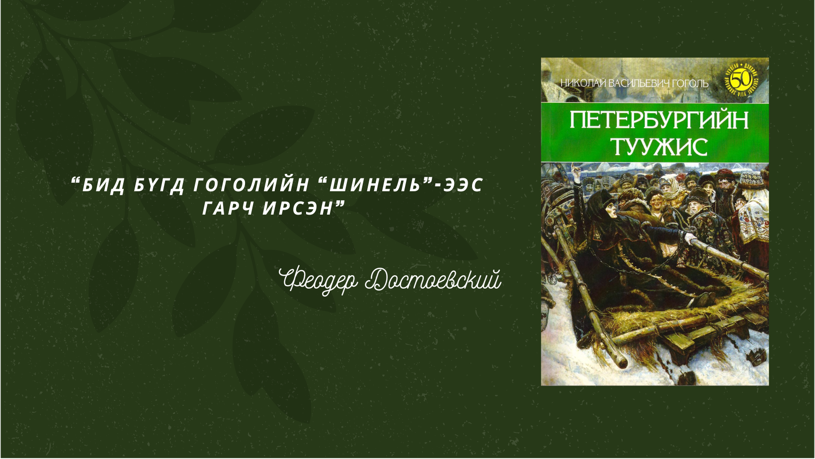 Үнэндээ эл зохиолын агуулга маш товчхон л доо. Оросын хамгийн доод тушаалтай ядуу түшмэл өөрийнхөө оюун санааг устган, өөрийгөө дахин төрүүлнэ. Энэ нь түүний маш чухал шийдвэр гарган байж хийлгэсэн шинэ шинель юм. Гэтэл түүнийгээ хийлгэж өмссөн, бусдаар шагшин магтуулсан өдрөө л оргүй хоосон гудамжинд дээрэмдүүлчихэж байгаа юм. Үнэндээ залуус байсан л даа. Гэхдээ би хоосон гудамжинд дээрэмдүүлсэн, өөрийнхөө нээсэн шинэхэн ертөнцийг харанхуйд залгиулсандаа болоод харамсан гашуудаж үхсэн гэж сэтгэх дуртай. Эл зохиолын мөн чанарыг тайлахыг тулд Набоков шиг дээд зэрэглэлийн уншигч хүртэл “Алив, надад, ургуулан бодох, урнаар төсөөлөх авьяастай уншигчийг заагаад аль. Чухам түүнд зориулагдсан тууж юм шүү дээ, энэ чинь” гэсэн буй. Их зохиолч маань эл үгийг өөртөө л хэлж байсан хэрэг.