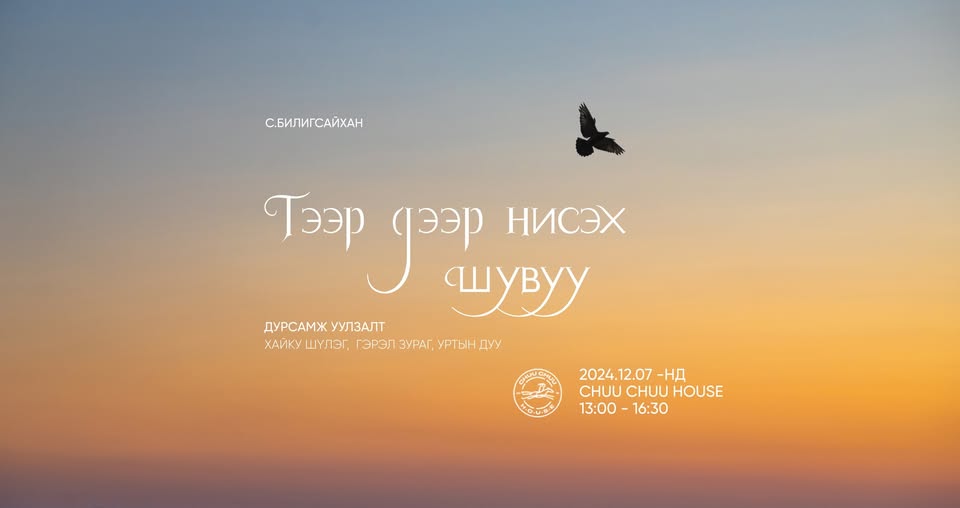 Яруу найрагч Зос овогт С.Билигсайхан агсны хайку шүлгээс бүтсэн "Тээр дээр нисэх шувуу" номын нээлт энэ сарын 7-нд болно. Энэхүү ном нь гэрэл зурагчин У.Ганбаярын гэрэл зурагтай хослон гарч байгаагаараа онцлог байна. Номын нээлт "CHUU CHUU HOUSE"-д болох юм. С.Билигсайхан агсны хувьд 2006 онд "Өвс өвсөө үнснэм" шүлгийн түүврээ хэвлүүлсэн байдаг.