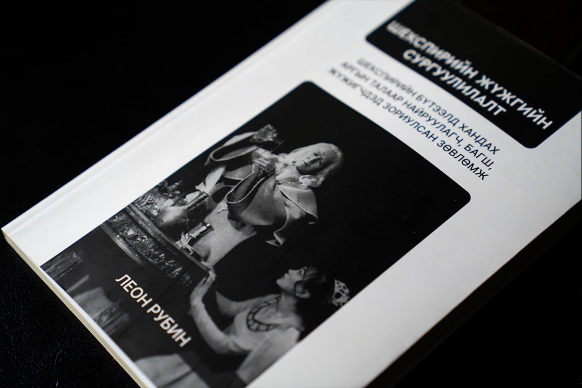 “Шекспирийн жүжгийн сургуулилт” ном зохиогч Леон Рубиний хүүрнэлээр хөврөх бөгөөд унших явцад сонирхолтой хэсгүүд ч олон дайралдаж байна. Тухайлбал, номын эхэн хэсэгт “Жүжгийн сонголт” гэсэн гарчиг дор “...Хэвлэлд ярилцлага өгөх үед, мөн манай оюутнууд “Таны хамгийн дуртай Шекспирийн жүжиг юу вэ” гэж надаас байнга асуудаг бөгөөд миний сонирхол байнга өөрчлөгддөг тул би хэзээ ч тодорхой хариулж чаддаггүй. Үнэнийг хэлэхэд, тэр үед миний ой тоонд хэчнээн олон жүжиг хөвж байсан ч, тухайн үед миний барьж авсан жүжиг бол миний хамгийн дуртай зүйл болж хувирдаг...” гэжээ.