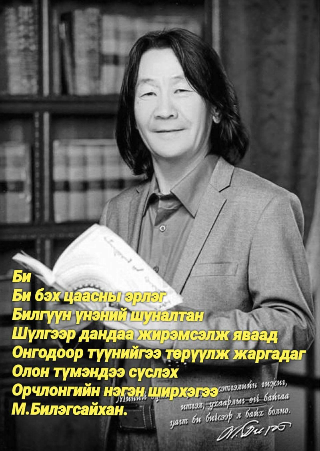Тэлмэн жороо гол, элс хоёрын садан...” гэж төрсөн нутгаа, тэртээх бага насныхаа тухай “Хазар азаргын нуруу”-ндаа бичсэн. Тэрбээр Говь-Алтай аймгийн Халиун сумын Олонбулагбагт төрсөн байдаг. Уран бүтээлээ 90-ээд оноос эхэлж “Хар азаргын нуруу”, “Сүүний үнэртэй хорвоо” зэрэг шүлгийн ном хэвлүүлснийг уншигчид андахгүй мэднэ. М.Билэгсайхан найрагч “Болор цом” яруу найргийн наадамд удаа дараа шагналт байранд орж, үзэгчдийн шагналыг хүртсэн байдаг. Түүний шүлгүүд нэг тийм бардамхан, ирмэгхэн уншигддаг. Хэн ч сулбагар, сул уншихын аргагүй мөр, шад бүр нь бадрангуй, сонссон хэнийг ч хөглөдөг. Алтайн өндөр уулсад хүргэж, тэр нутгийнх биш ч тийш очмоор тэмүүллийг өгдөг. Тэгсэн атлаа гэгээн, зөөлөн аястай. Бахархаж, дурсаж, хайрлаж, байгаа бүхэндээ сэтгэл тэнүүн байгаа хандлага нь бадаг бүрээс нь мэдрэгдэж, ээвэр дулаан, саруул Монгол нутгийг ийм л хүмүүн онож төрнө дөө гэмээр бодол ч үүтгэдэг. Үнэндээ орчин цагт монгол хүн монголоороо байхаа больсон.