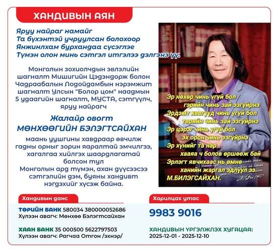 Түмэн олон минь сэтгэл итгэлээ дэлгэнэ үү...”.