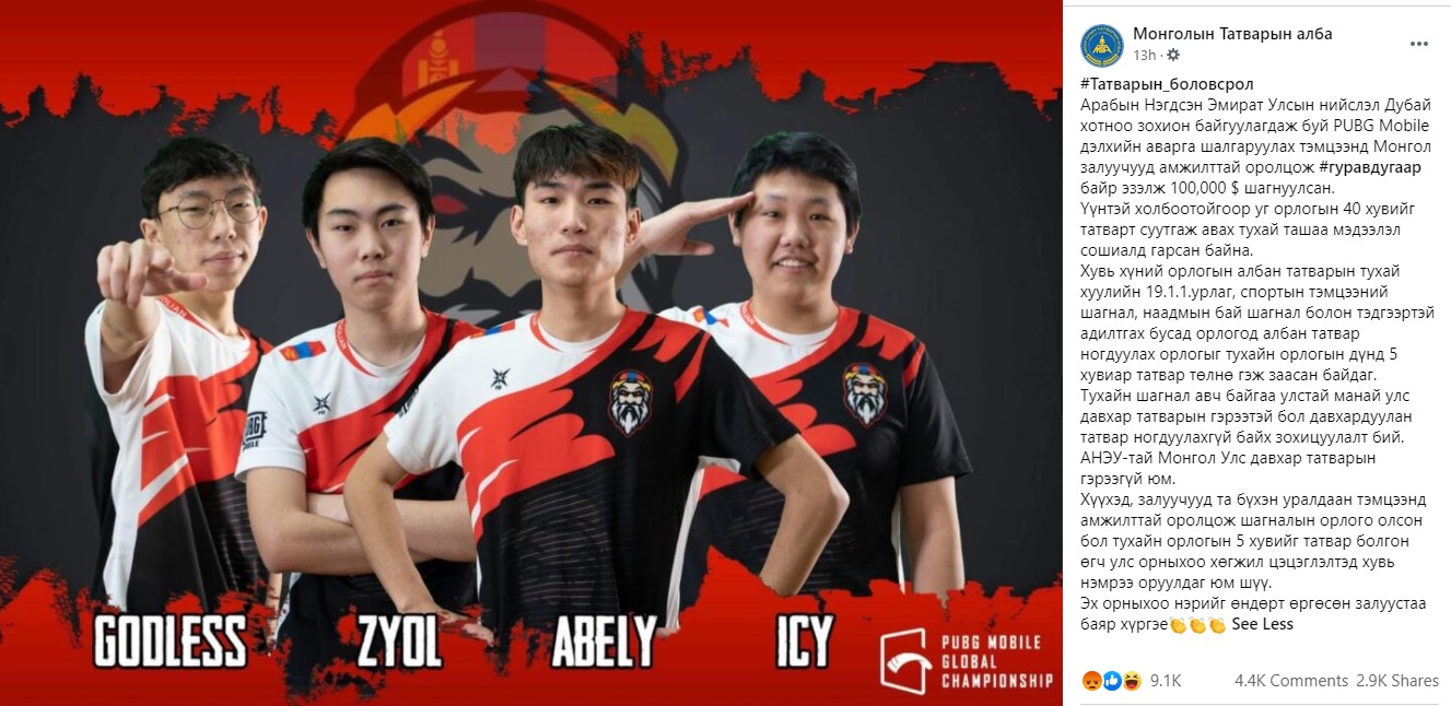 Арабын Нэгдсэн Эмират Улсын нийслэл Дубай хотод “PUBG mobile” видео тоглоомын дэлхийн аварга шалгаруулах тэмцээн болсон. Тус тэмцээнд манай орны “ZEUS” баг амжилттай оролцон, хүрэл медаль хүртэж, 100 мянган ам.долларын шагнал хүртсэн билээ.