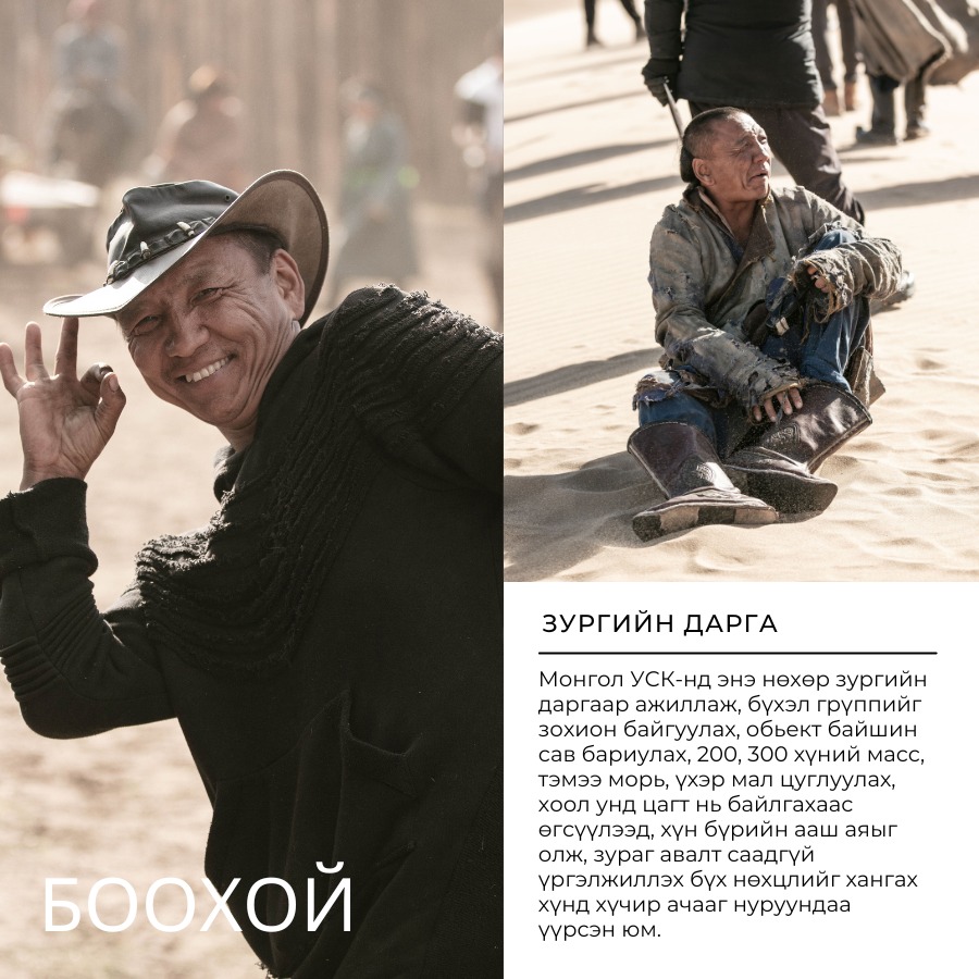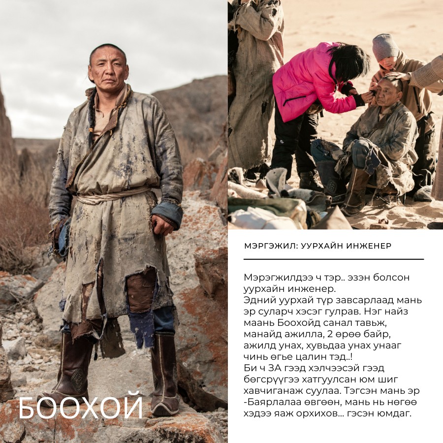 -Энэ миний тоглосон хоёр дахь кино. Урьд нь Амараагийн тоглосон олон ангит “Хохирогч” кинонд эсрэг дүрийн хэсэгт оролцсон. Тэр үеэр найруулагч Б.Амарсайхан “Боохой чамайг дараагийн кинонд зургийн даргаар тавьж магадгүй” гэсэн юм. Тэгээд нэг өдөр утасдаад ажил дээрээ дууддаг юм байна. Яваад очтол “Монгол” киноны зургийн даргаар ажиллах санал тавилаа. Мэдээж миний хувьд мэргэжлийн биш, өмнө хийж байсан туршлагагүй болохоор эргэлзэж, “Чадах болов уу” гэсэн чинь Амараа “Зүгээр ээ, чиний л хийх ажлын нэг, би бүгдийг нь хийгээд, заагаад, зөвлөөд өгнө” гэсэн юм. Ингэж л найз минь надад том итгэл хүлээлгэсэн юм даа. За тэгээд болоогүй ээ, дахиад хэд хоногийн дараа Амараа залгаад, “Зургаа даруулаад явуулаач” гэлээ. Тэгээд мөн яваад очтол миний зургийг хэвлэж гаргаад доод талд нь Гүрвэл Мажиг гээд биччихэж. Би ч палхийгээд л явчихлаа. “За энэ нөхөр намайг яг алах нь” гэж л бодсон. Гэсэн ч намайг чадна гэсэн итгэлээр оноож байгаа байх гээд дүр, зургийн даргын ажил хоёуланг нь хүлээн авч, хичээж ажилласан.