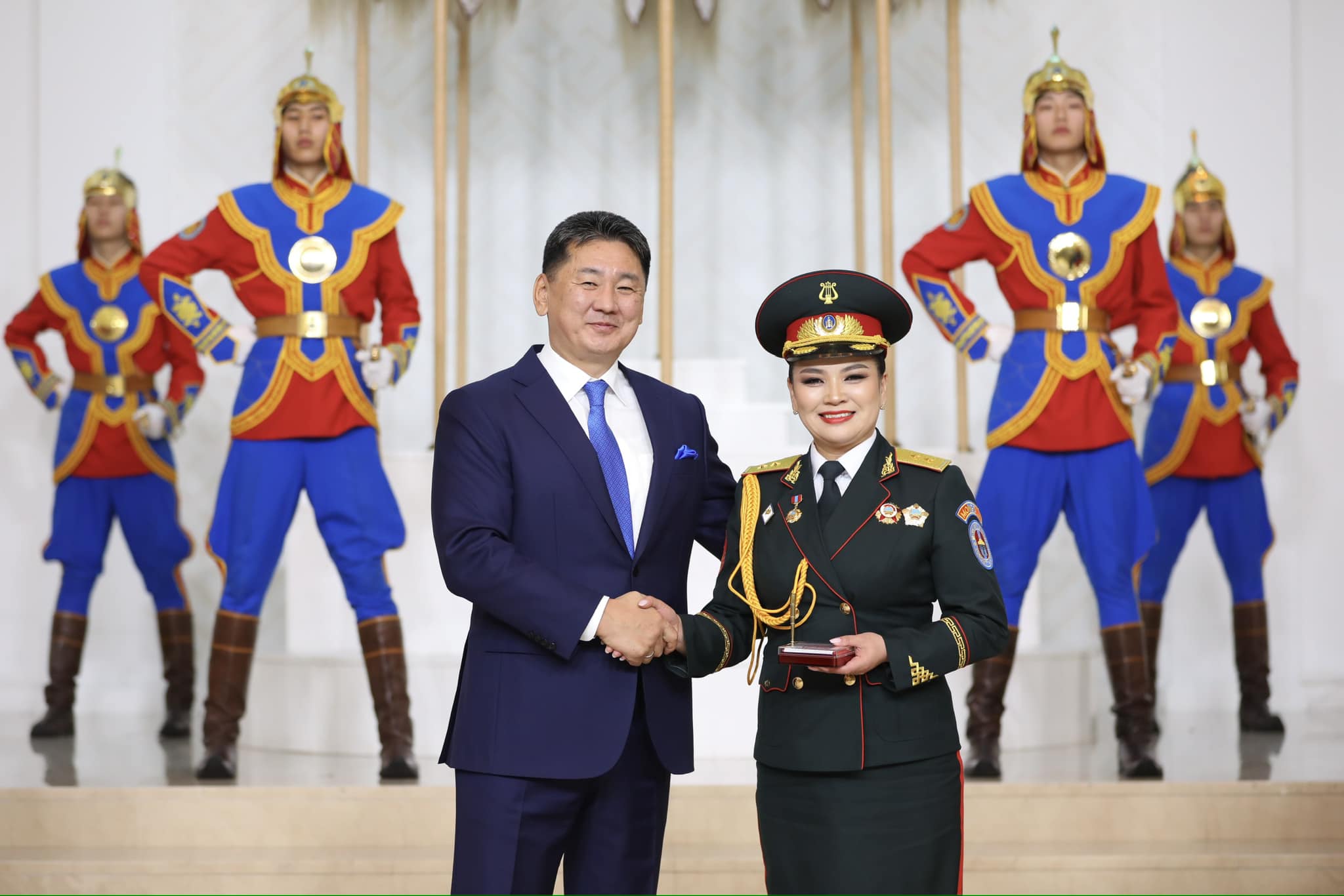 Тэрбээр “Соёлын гавьяат зүтгэлтэн гэх цолоор шагнасан өндөр төрийн хүндэтгэлд эгэл жирийн бүсгүйн хувьд туйлаас баяртай байгаа. Монгол төрийн ёслолын их танхимд, тэрхүү ёслол бэлгэдлийн асар том өргөөнд, монгол төрийн дагшин хийморьтой, хүндэт харуулын дайчин эрсийн өмнө алтан соёмботой малгайгаа өмсөөд зогсоно гэдэг бүсгүй хүний хувьд том бахархал. Хийморьтой эрчүүдийн жагсдаг ариун эгнээнээс алдрын зэрэгт хүрнэ гэдэг асар том хариуцлага. Өдөр өдрийн зүтгэл, өндөр ч хүндэтгэл. Тэр мөчид би соёмбоны наран дундаас аавынхаа нүдийг олж харсан” гэснээр бидний яриа эхэлсэн юм.