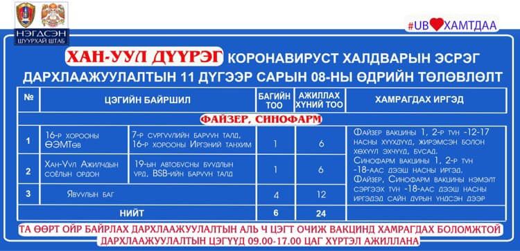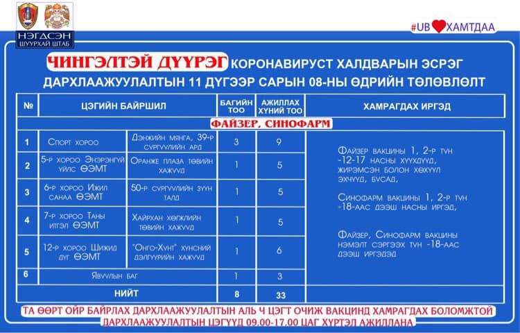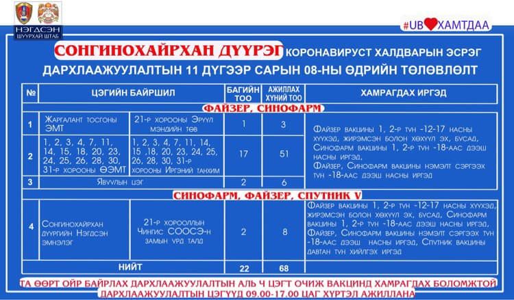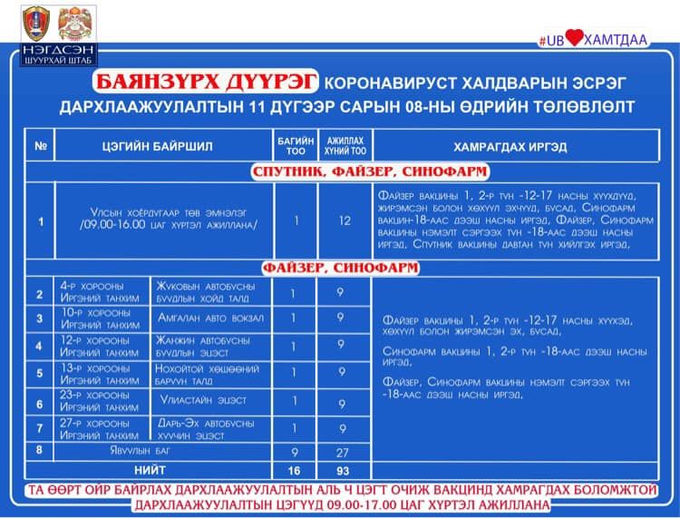 Өнөөдөр нийслэлд дархлаажуулалтын явуулын 42, суурин 43 цэгт 94 багийн 367 эмч, ажилтан ажиллана. Дархлаажуулалтын цэгүүд 09:00-17:00 цаг хүртэл ажиллах бөгөөд нийт 5628 иргэнийг дархлаажуулахаар төлөвлөжээ.