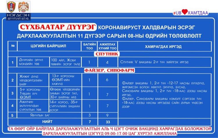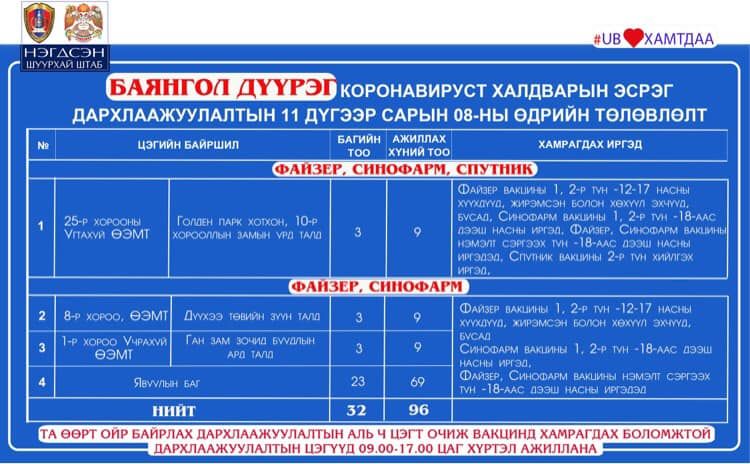 Вакцинжуулалт эхэлснээс хойш нийслэлийн нийт хүн амын I тунгийн хамралт 74.7 хувь, II тунгийн хамралт 71 хувь, нэмэлт тунгийн хамрагдалт 21.8 хувь байна. Мөн 2956 жирэмсэн эх, 12-15 насны 67620 , 16-17 насны 26588 хүүхэд тус тус дархлаажуулалтын бүрэн тунд хамрагдсан байна.