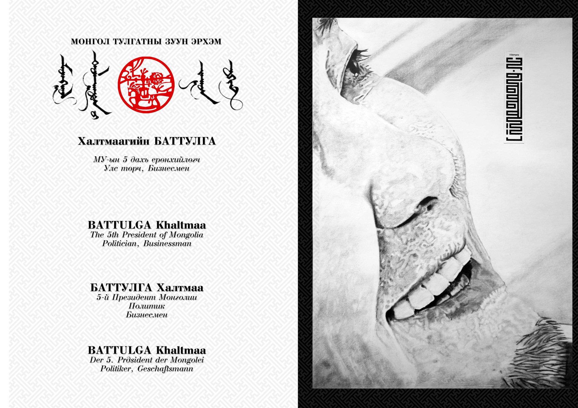 Тиймээс л маш анхааралтай зурах хэрэгтэй. Би хүнийг таньж, мэдэхийн тулд хөрөг зураг руу орсон. Аав минь бурхан зурдаг байсан учраас түүнийг нь байнга ажигладаг байлаа. Бурхныг тэг зургийн аргачлалаар зурдаг. Бурхан зурахдаа нэг миллметр алдвал нүгэл болно гэдэг. Аавынхаа зурдаг тэг зургийн аргачиллыг өөрийнхөө хөрөг зургийн аргачлалд оруулсан. “Монгол тулгатны зуун эрхэм” нэвтрүүлгийн оролцогчдын хөрөг тэг зургийн аргачлалаар бүтсэн. Өөрөөр хэлбэл, миллиметрийн зөрүүгүй зурсан гэсэн үг. Мэнгэтэй бол мэнгийг нь, шарх, сорви, үрчлээ гээд ямар ч хачиргүйгээр зурсан. Анхны үзэсгэлэнгээ гаргахад шог зураач С.Цогтбаяр ах маш их дэмжлэг үзүүлсэн. “Монгол тулгатны зуун эрхэм” нэвтрүүлэг нь “Херо” энтертайментийн уран бүтээл учраас оюуны өмчийн зөвшөөрөл авах шаардлагатай. Энэ бүхэнд С.Цогтбаяр, ах тусалсан.