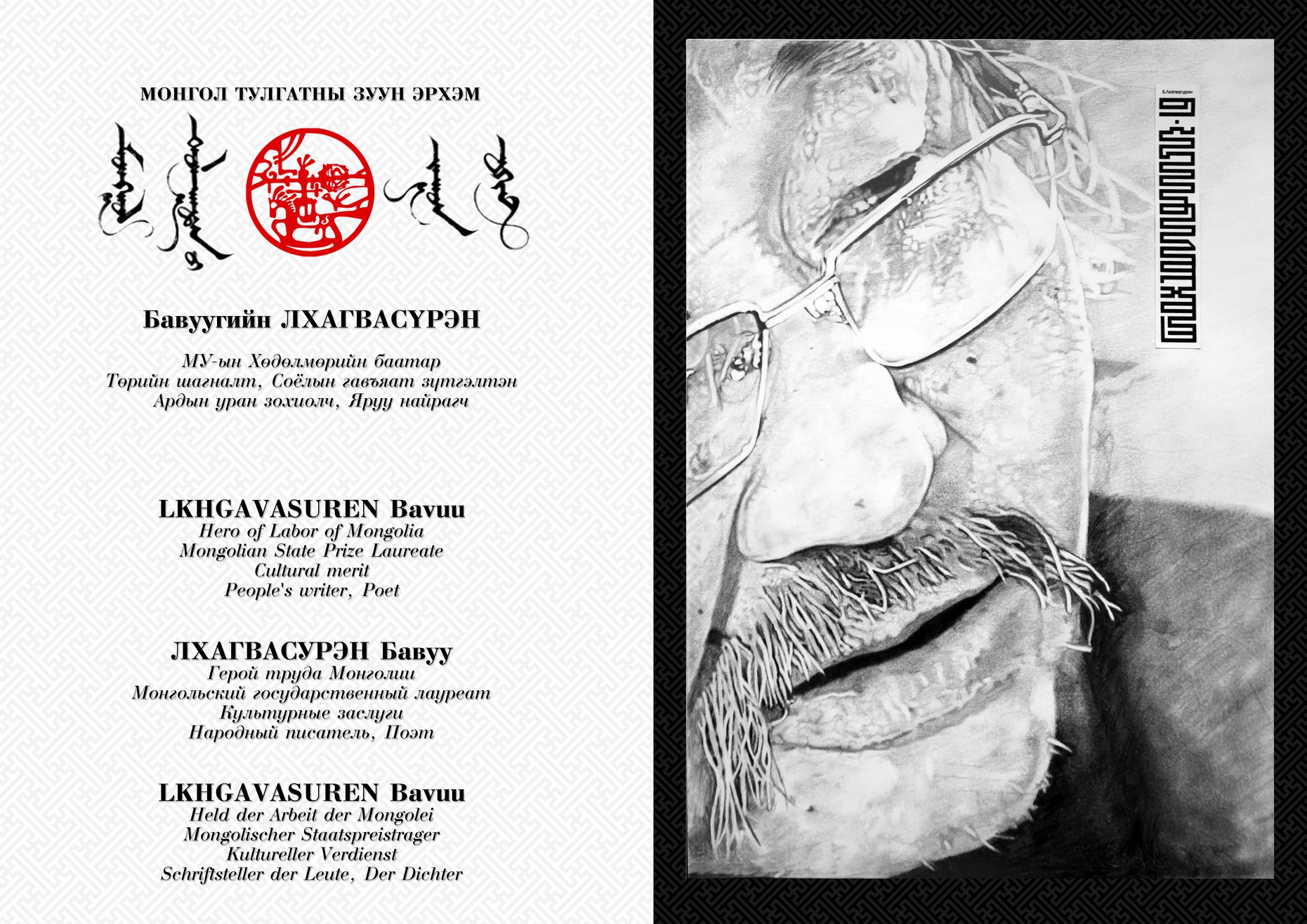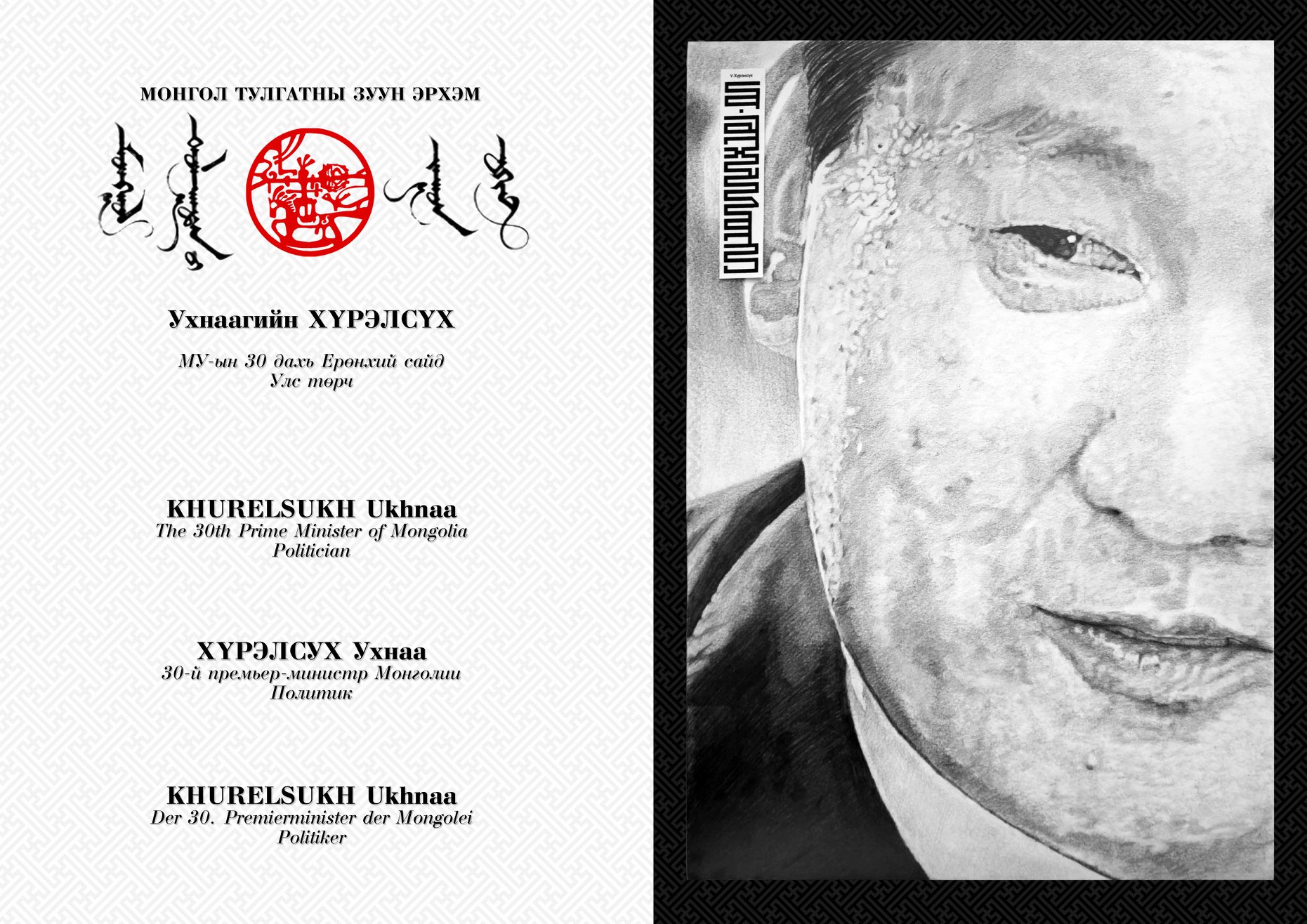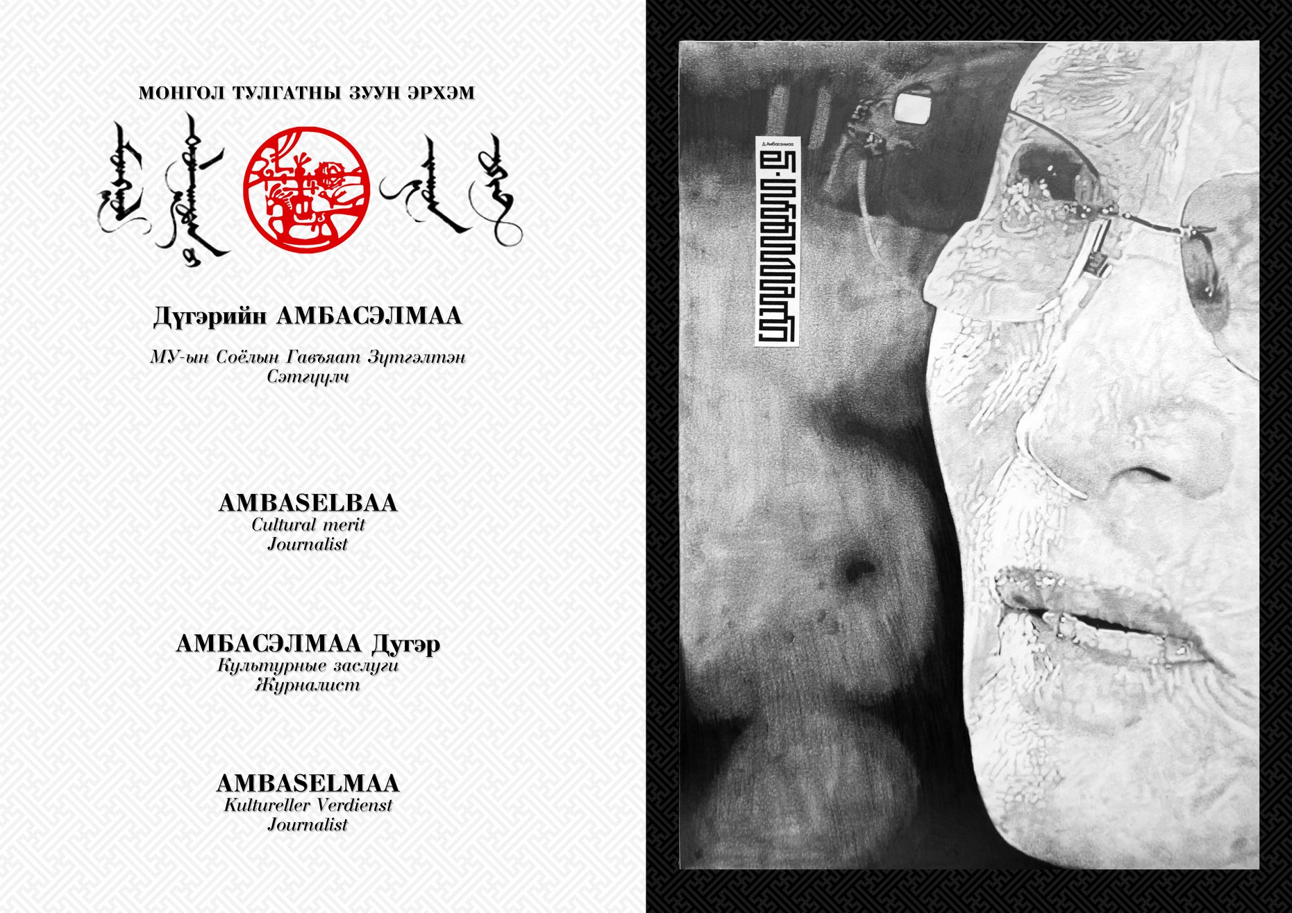 Нэг хүнийг зурахдаа нэг нэвтрүүлгийг 10-20 удаа давтаж үзсэн. Өмнө нь орж байсан нэвтрүүлгүүдийг нь ч давхар үзэж байлаа. Сонссон, дуулснаа тунгаана. Үүний эцэст энэ хүмүүсийг хэдэн арван жил судалсан ч тухайн хүнийг 100 хувь бүрэн таньж чадахгүй юм байна гэх ойлголттой болсон. Харин өөрийнхөө хэмжээнд таньсан учраас хөргийг нь тал зурсан юм. Надад харагдаж байгаа ертөнцийг өөрийнхөөрөө зураад нөгөө талд нь тухайн хүний өөрийнх нь ертөнцийг үлдээсэн. Хүнийг тал зурсан ч бүх зүйл анзаарагддаг. Гэхдээ би тал хүн бүтээгээгүй. Хөрөг зургийн баруун дээд булан монгол бичгийн нэхмэл үсгээр нэрийг нь бичсэн. Хорвоо ертөнц дээр хүнийг бүтэн болгодог хоёр зүйл бий. Нэг нь хүний бие, нөгөө нь нэр нь. Энэ хоёр нийлж гэмээнэ хүн бүтдэг. Амьдралдаа хийж бүтээсэн зүйл нь түүнийг хүн шиг хүн болгодог юм гэнэ лээ. Дэлхий дээр амьдарч байгаа бүх хүнийг хүн гэх үү, эсвэл үгүй юү. Монголчууд хүүхдээ хүн шиг хүн болгон өсгөх гэж ярьдаг. Хүн байна гэдэг нь зөвхөн алхаж, гишгэж, амьсгалах биш юм” хэмээв. Энэ зарчим нь надад түүний амьдралын философи байх гэсэн бодлыг төрүүлсэн юм.