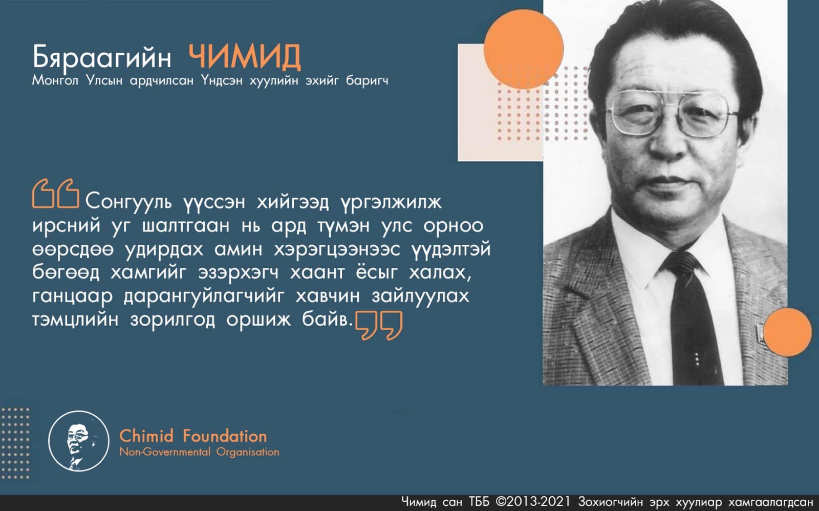 Тэр ийн ааш муутай юм шиг царайлж суухдаа бүх хүч хөдөлмөр, ухаан, тэвчээрээ төрийн ажилд буюу хууль зүйн шинжлэх ухааныг хөгжүүлэхэд түүн дундаа Монгол Улсын Үндсэн хууль, хуулийг эргэцүүлэх бүхий л ажилд өөрийгөө бүрэн зориулсан байдаг. Зөвхөн ажлын төлөө, сайн хууль боловсруулж, үр хойчдоо тогтвортой амьдрал цогцлоохын төлөө идэх хоол, унтах нойроо хугаслан байж зүтгэсэн гавьяаг нь бид өнөөдрийг хүртэл хүртэж яваа. Б.Чимид гуай 1921-2000-аад он хүртэлх бүх хуулийг эмхэтгэн цэгцэлж, системчилсэн онол, арга зүйн үндсийг боловсруулж, редакторлаж, батлуулж чадсанаараа Монгол Улсын Хөдөлмөрийн баатар цол хүртсэн. Энэ нь түүний хийж чадах, хийх л ёстой үүрэг байсан юм шиг санагддаг нь Үндсэн хуулийг Б.Чимид гуайгаас өөр хүнээр төсөөлөхийн аргагүйтэй холбоотой биз ээ. Монгол Улсын Үндсэн хууль буюу эцэг хуулийг өөрийн тархиар боловсруулан бойжуулсан Хөдөлмөрийн баатар, Ардын багш, Гавьяат хуульч, доктор, профессор Б.Чимид агсны Мөрөнгийн хонхорт хөтлөлцөж, аймгийн клубт бүжиглэж, бүх амьдралаа хамтдаа туулсан халамжит хань Б.Цээрэгзэнтэй ярилцлаа.