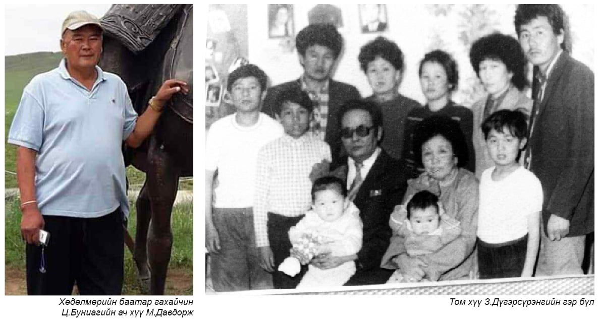 Түүнд “Таны бага дүүд тань Ц.Буниа гуайн талаар ярилцах санал тавьсан ч таныг л илүүтэй мэднэ гээд биднийг танайх руу явууллаа” гэхэд М.Даваадорж гуай “Ах болохоор нь л тэгж байгаа юм. Түүнээс бидний мэдэж байгаа түүх, амьдралын замнал нэг. Аав минь бас залуухнаараа нас барсан учраас бид чинь аав, ээжийнх нь талаар асууж ч мэдэхгүй өнгөрчээ. Нас ахиад ирэхээр удам судрынхаа үүх түүхийг мэдэх гэж, үр хүүхдүүддээ хэлж өгөх гэж асууж сурагламаар болдог юм байна. Би 1961 онд төрсөн. Намайг төрсний дараа жил буюу 1962 онд анхны Хөдөлмөрийн баатар гахайчин төрсөн нь Ц.Буниа эмээ юм билээ. Сонин хувь тохиол юм шүү. Намайг долдугаар ангид байхад ээж минь З.Дүгэрсүрэн аавтай гэр бүл болсон. Бид сургуульд сурч байхдаа Хөдөлмөрийн баатар Ц.Буниа гэж хүний тухай ном, сонин дээрээс уншиж байснаас биш, хожим миний эмээ болно гэж яахан мэдэх билээ. Хувь тавилангаар бид нэг гэр бүл болж, сайхан амьдарцгаасан. Аав минь түшигтэй сайн хань, бидний сайн аав байсан. Биднийг хэнийг нь хэн гэлгүй хүмүүжүүлж, хайрлаж, ажил хөдөлмөрт сургаж, амьдралын төлөө тэмцдэг, болж л өгвөл бусдад тус дэмтэй явахыг хичээдэг хүмүүс болгож өсгөсөн дөө” гэв.