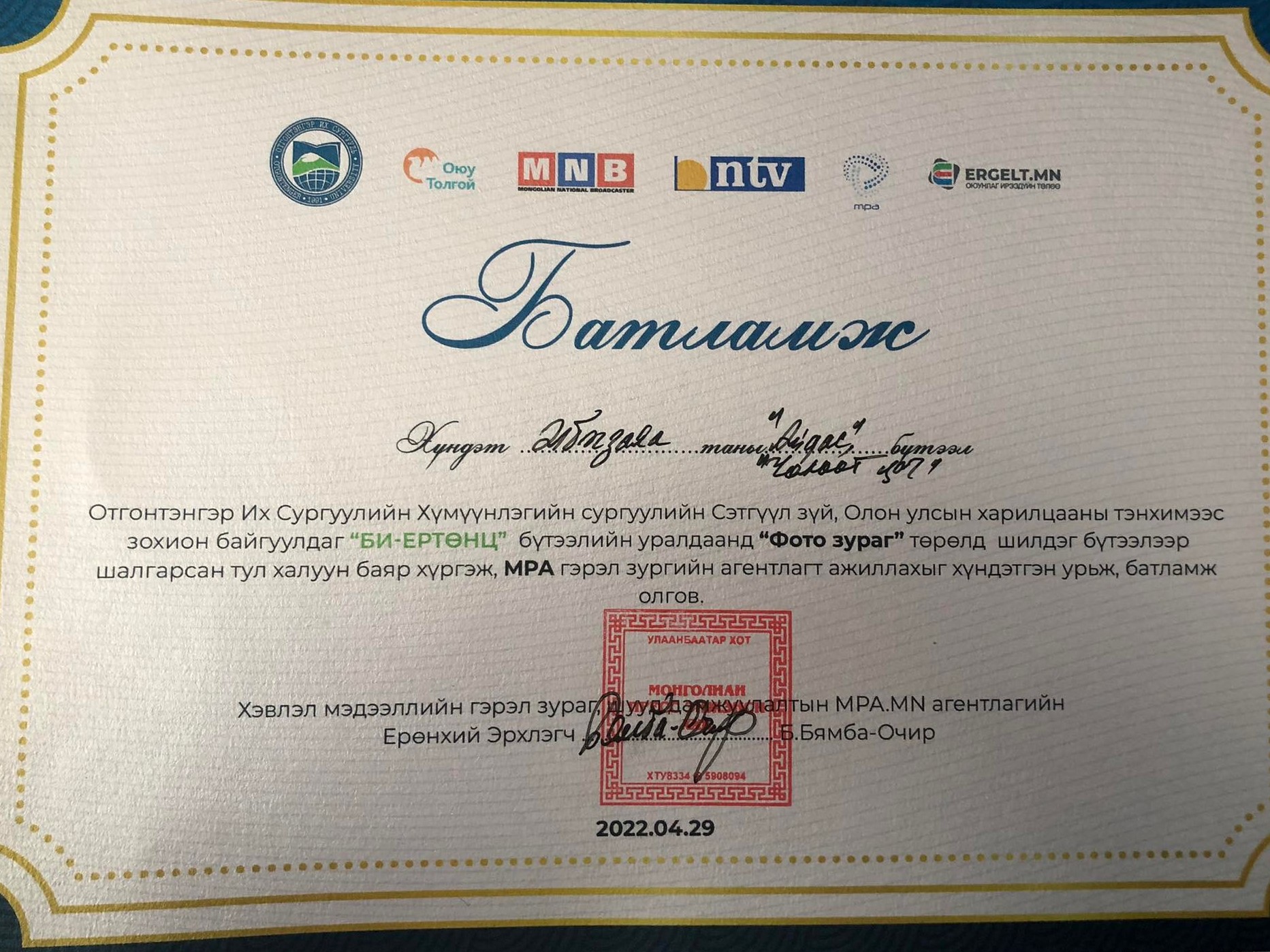 -Ер нь орчин үеийн сэтгүүлчид олон төрлийн ур чадвартай байх ёстой болоод байгаа. Тэмцээнд оролцох нь эдгээр ур чадварыг хөгжүүлэх ач холбогдолтой байх. Хичээлээ зүгээр сонсоод суух биш сонссон, мэдсэн шинэ зүйлүүдээ бодитоор хэрэгжүүлэх боломж олдож байгаа юм. Суралцангаа давхар ажиллана гэдэг олон давуу талтай. Үеийн хүүхдүүдээс илүү ур чадвартай болохын сацуу, мэргэжлийн үнэ цэн, ажлын байран ямар байдаг гэх мэт зүйлийг өөрийн биеэр үзэх, мэдрэх нь ирээдүйд илүү сайн сэтгүүлч болох бат бөх суурь болж байгаа юм. Надад гэрэл зургийн MPA агентлагт ажиллах санал тавьсан. Одоогоор хичээл амрах дөхөөд ачаалал ихтэй болохоор уулзаагүй. Амралт эхлээд, дүнгээ гаргуулчихаад ажиллах бодолтой байгаа. Оюутнууд зун болохоор цагийн ажил, зөөгч, туслах гэх мэт олон ажил хийдэг. Мэргэжлийн хүрээнд ажиллах нь тун ховор. Учир нь их сургуулиа төгсөөгүй болохоор хүлээж авах газар байдаггүй. Суралцах хугацаандаа ажиллах боломж олдоно гэхэд ховорхон тохиох зүйл гэж бодож байна.
