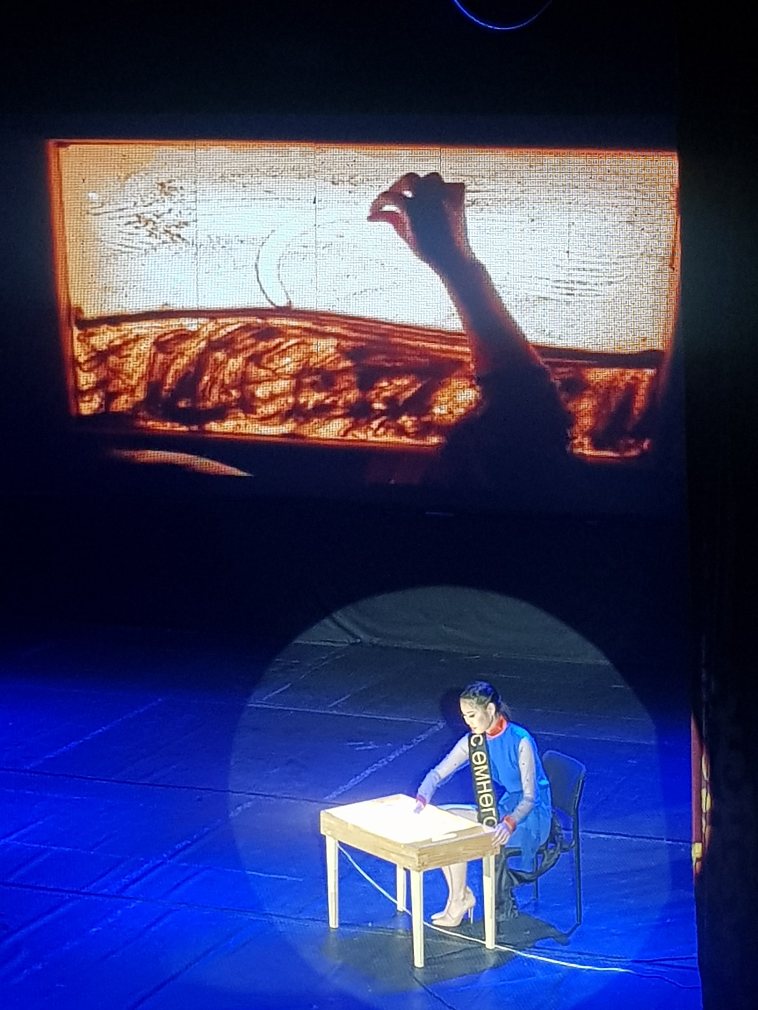 -Нутгийнхаа онцлогийг харуулах гэж элсэн зураг зурсан. Зургийг харвал тэмээ гэр зэргийг зэрэглээтэж буйгаар харуулж зурсан. Зургаа зурахдаа миний ээж тэмээчин дууг эгшиглүүлж дотроо төсөөлж зурсан. Тэмцээний өмнөх өдөр хоёр цагийн дотор сурсан.