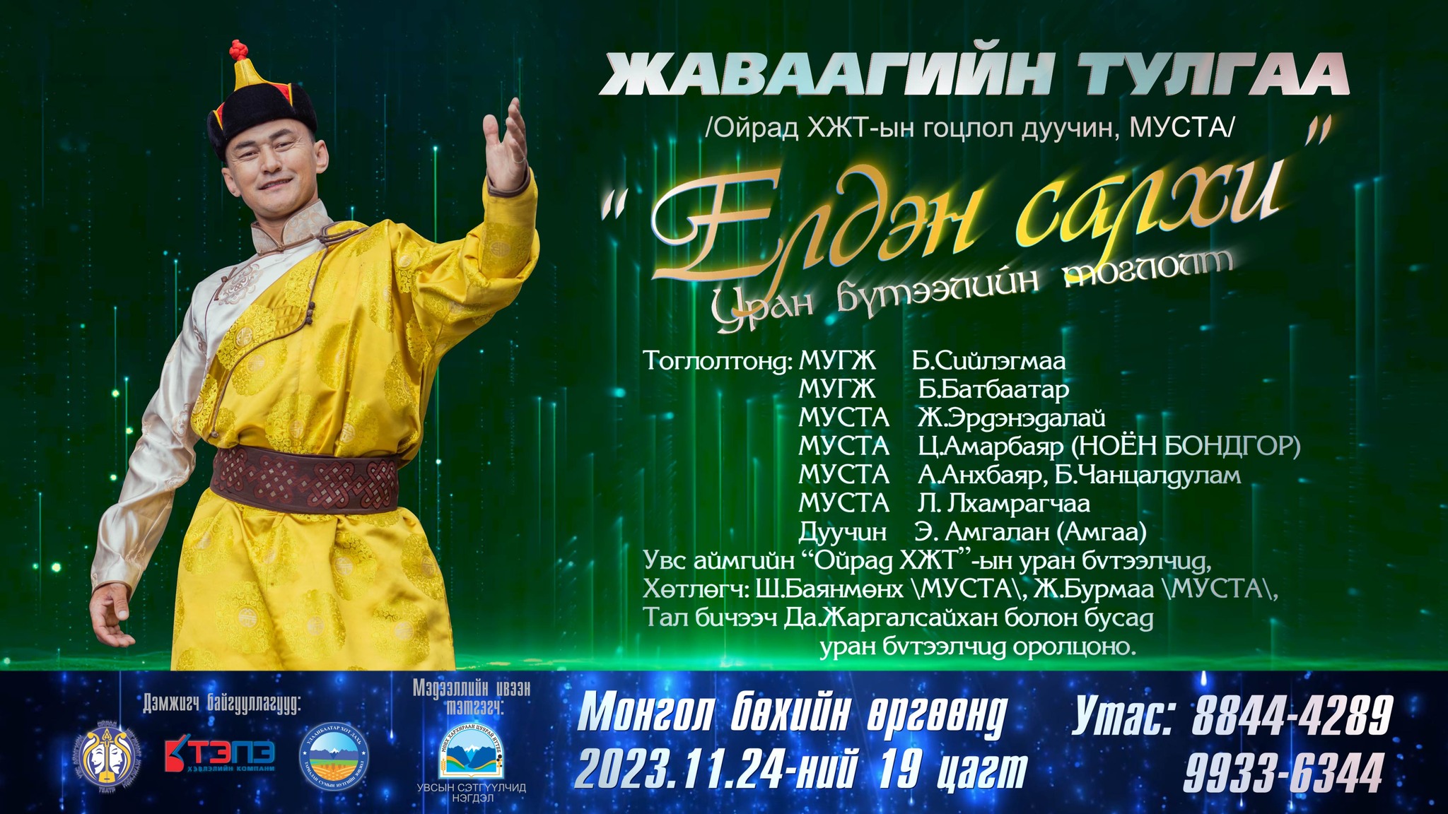 -“Елдэн салхи” уран бүтээлийн тоглолтоо 2023 оны арваннэгдүгээр сарын 24-нд 19:00 цагаас Монгол бөхийн өргөөнд хийнэ. Тоглолтонд маань Ойрад хөгжимт жүжгийн театрын уран бүтээлчид оролцохоос гадна МУГЖ Б.Сийлэгмаа, Б.Батбаатар, Ж.Эрдэнэдалай, МУСТА Ноён бондгор, А.Анхбаяр, Б.Чанцалдулам ,Л. Лхамрагчаа, дуучин Э.Амгалан нар ая дуугаа өргөх юм. Харин хөтлөгчөөр МУСТА  Ш.Баянмөнх,  Ж.Бурмаа, Тал бичээч Да.Жаргалсайхан нар оролцоно. Та бүхэн минь өргөнөөр хүрэлцэн ирээрэй.