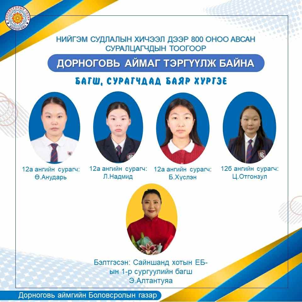 -Миний хувьд энэ жил 60 гаруй хүүхэд нийгмийн ухааны ЭЕШ-нд бэлдсэн. Заавал судлах агуулгын хүрээнд шалгалт авах байсан ч өөрчлөлт орж агуулга хичээлүүд нэмэгдсэн. Хүүхдүүдийнхээ хоцрогдлыг арилгаж, суурь чадварыг нь хөгжүүлэхэд анхаарч ажилласан. Чадварыг нь хөгжүүлсэн учраас шавь нар минь хүссэн оноогоо авсан байх.