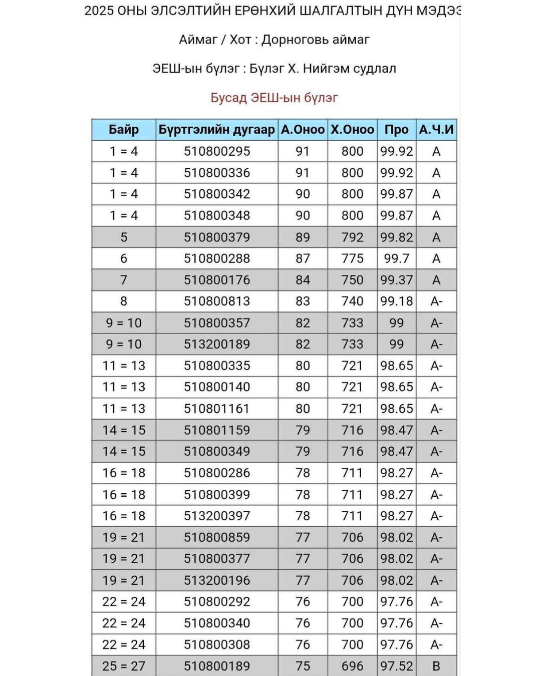 -Энэ жил миний шавь нараас 800 оноо авсан гурав дах тохиолдол. Шалгалтын дараа хүүхдүүдийнхээ анхны оноог сонсчхоод 800 оноо авсан хүүхэд байхгүй юм байж гэж бодсон. Гэхдээ хүүхдүүд минь хүссэн сургуульдаа орох хангалттай дүн аваасай л гэж хүссэн. Маргааш нь хэмжээст оноог нь шалгахад дөрвөн хүүхэд 800 оноо авч, ер нь бэлдсэн хүүхдүүдийг минь оноо өндөр байгааг хараад баярласан.