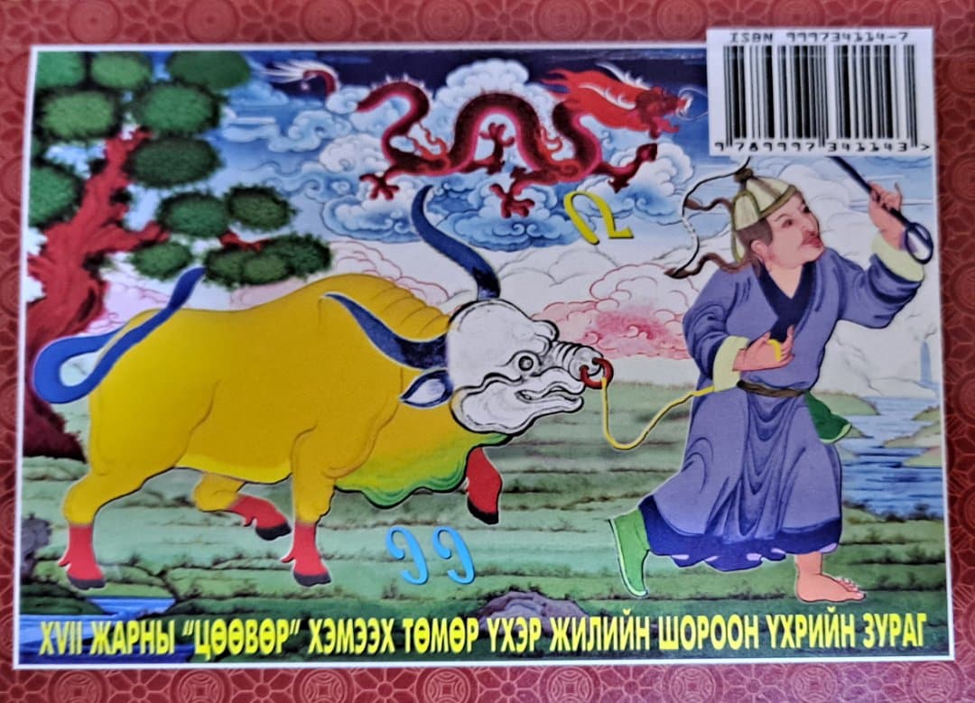 ҮХЭР НЬ: Толгой нь цагаан, бие, ходоод, өвчүү, цулбуур шар, омруу, туурай ногоон, эвэр, чих, сүүл хөх, дөрвөн шийр нь оготно улаан, амаа хамхиж, сүүлээ баруун тийш шарвасан байна.