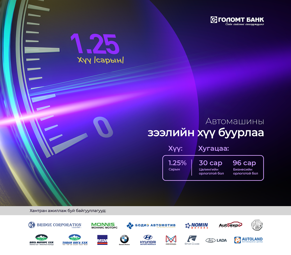 Голомт банкны автомашины хөнгөлөлттэй зээлийн талаарх дэлгэрэнгүй мэдээлэлтэй ЭНД дарж танилцана уу.