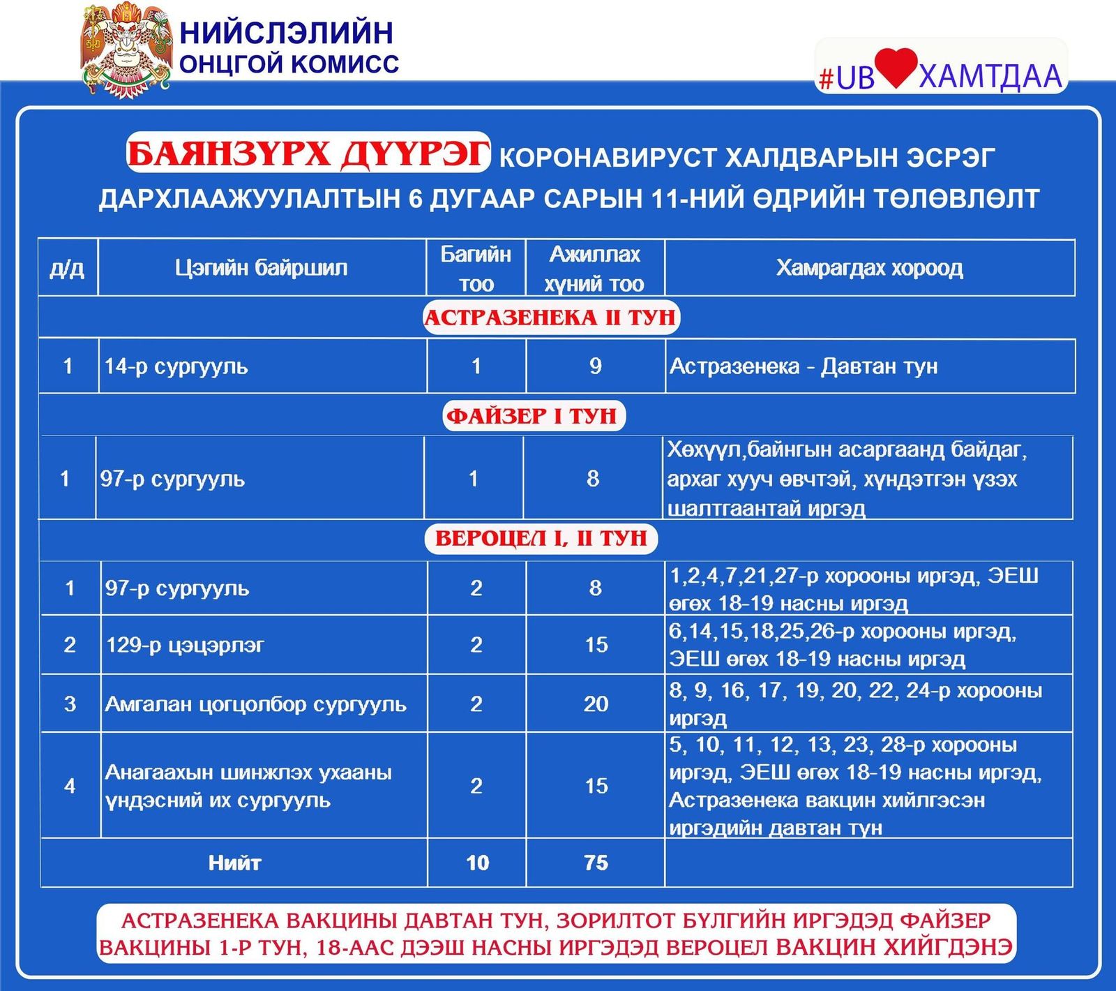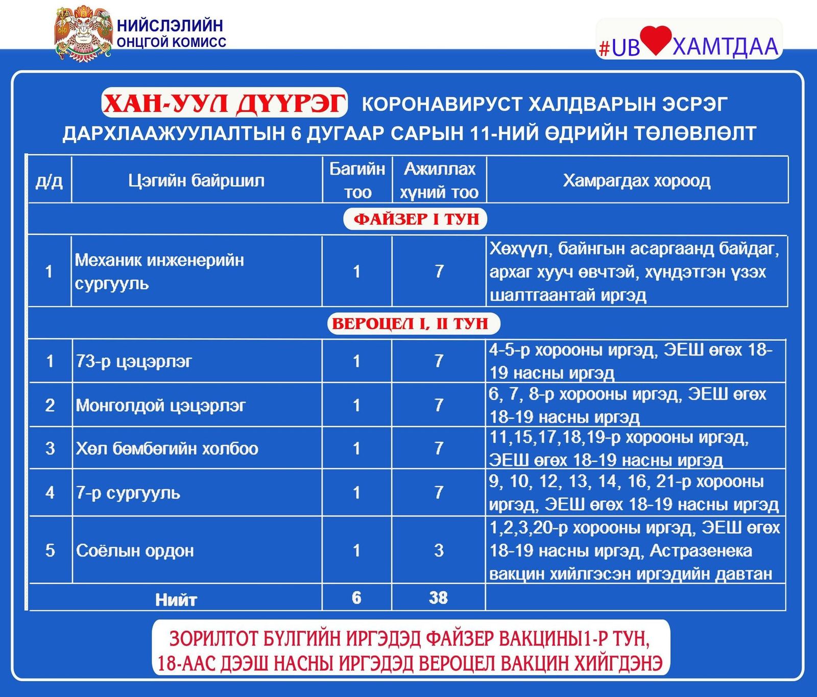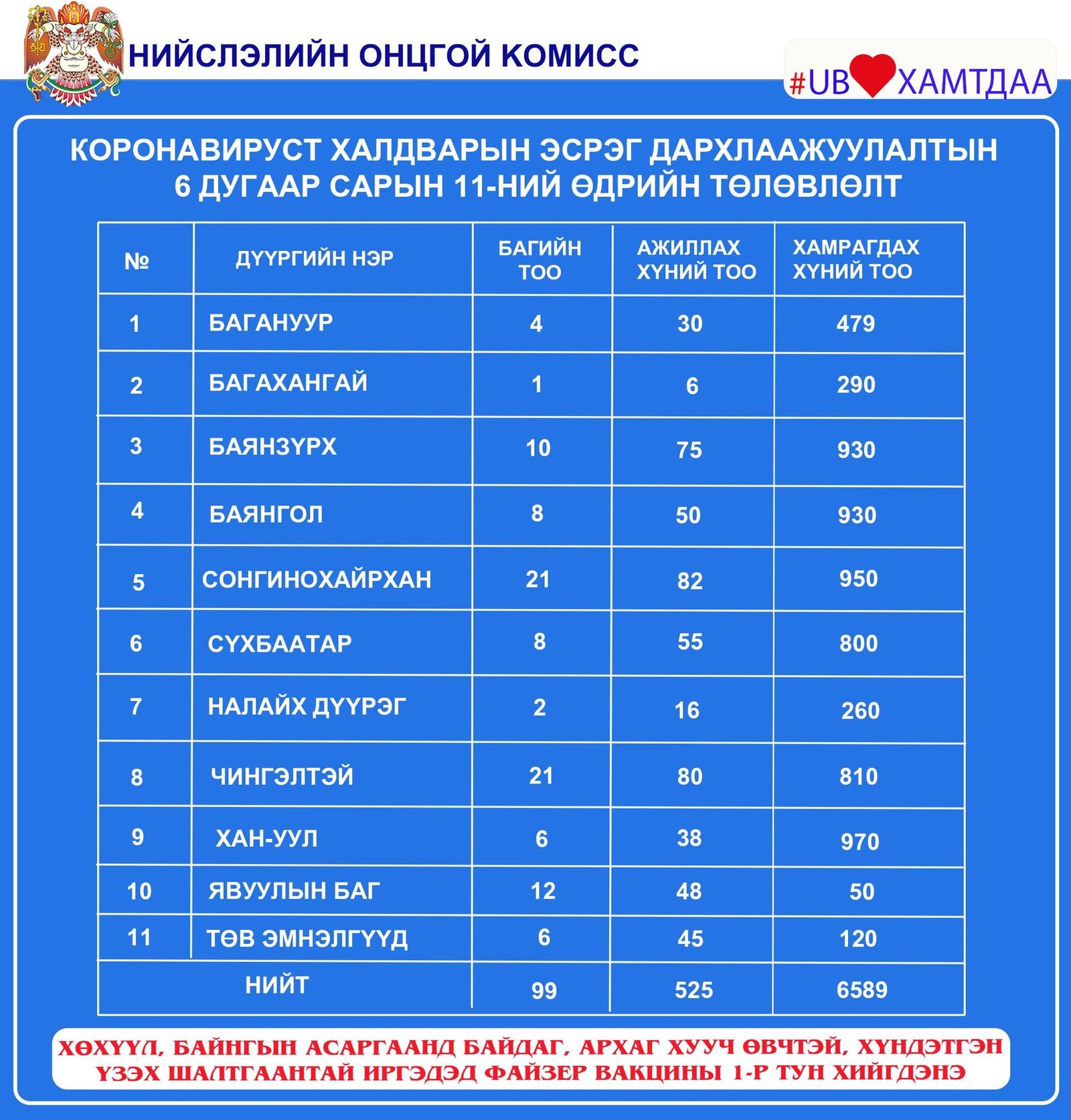 Улаанбаатар хотод өнөөдөр буюу зургаадугаар сарын 11-ний өдөр явуулын 12, суурин 42 цэгт нийт 6589 иргэнийг дархлаажуулахаар төлөвлөжээ.