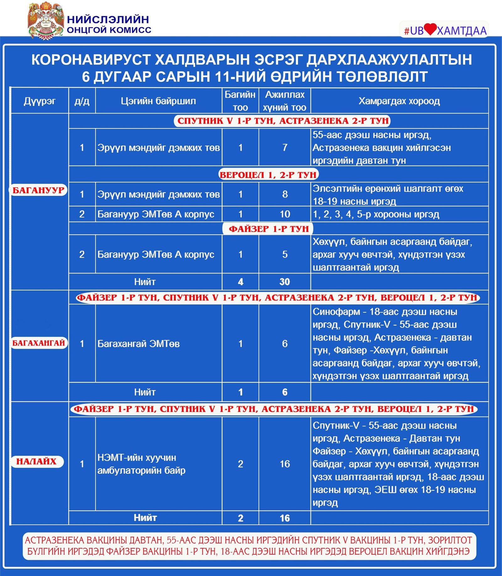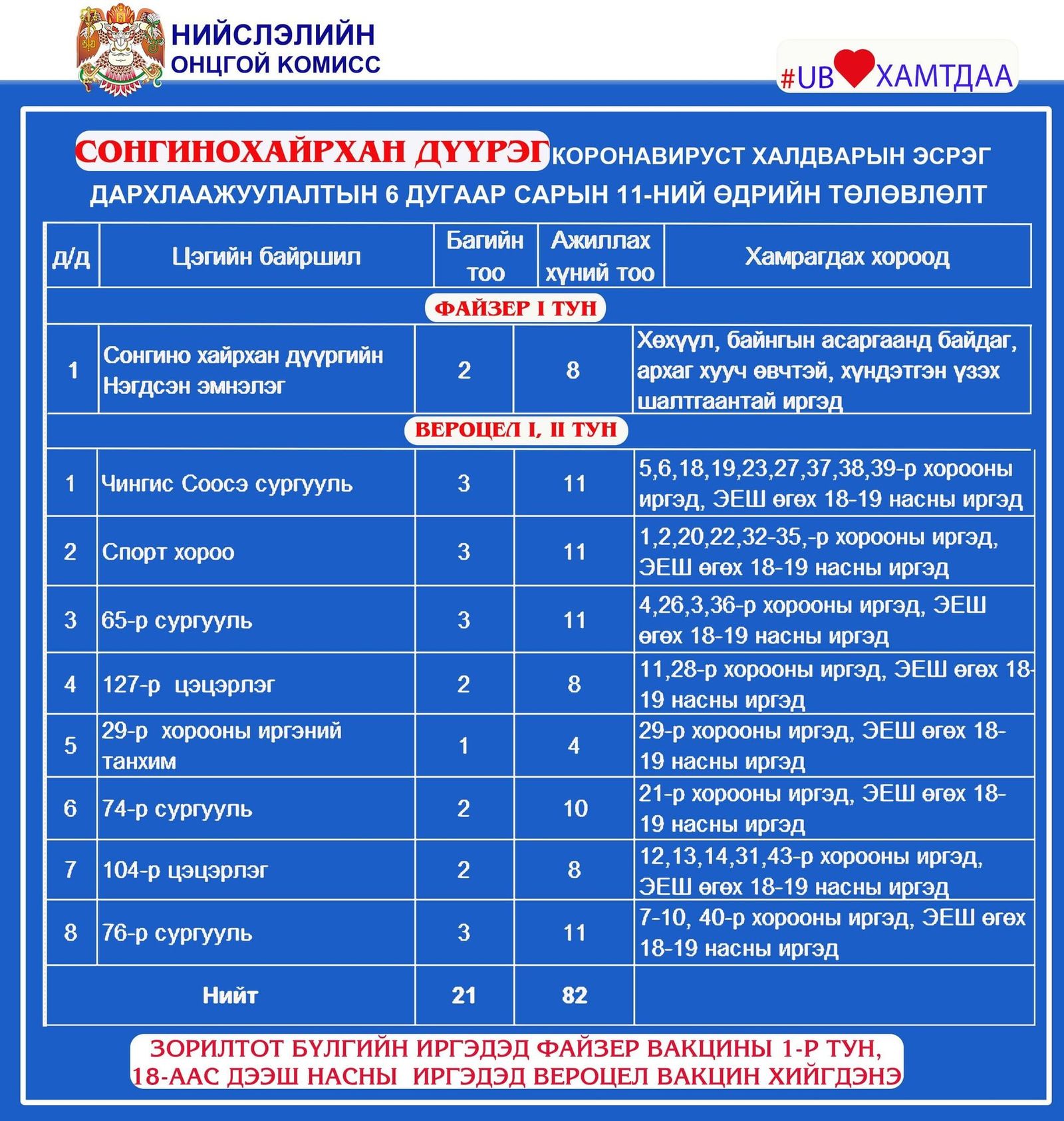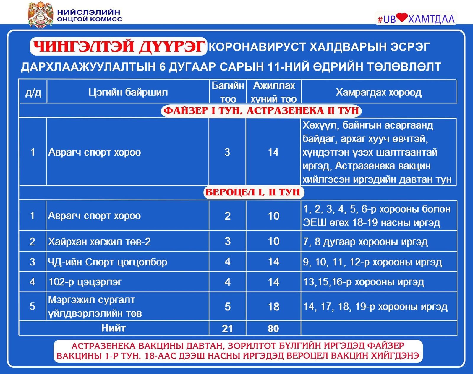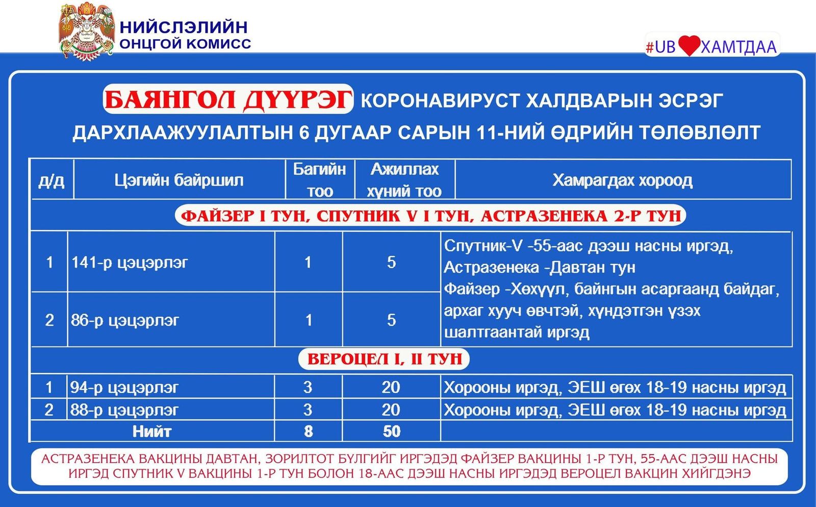 Улаанбаатар хотод өнөөдөр буюу зургаадугаар сарын 11-ний өдөр явуулын 12, суурин 42 цэгт нийт 6589 иргэнийг дархлаажуулахаар төлөвлөжээ.