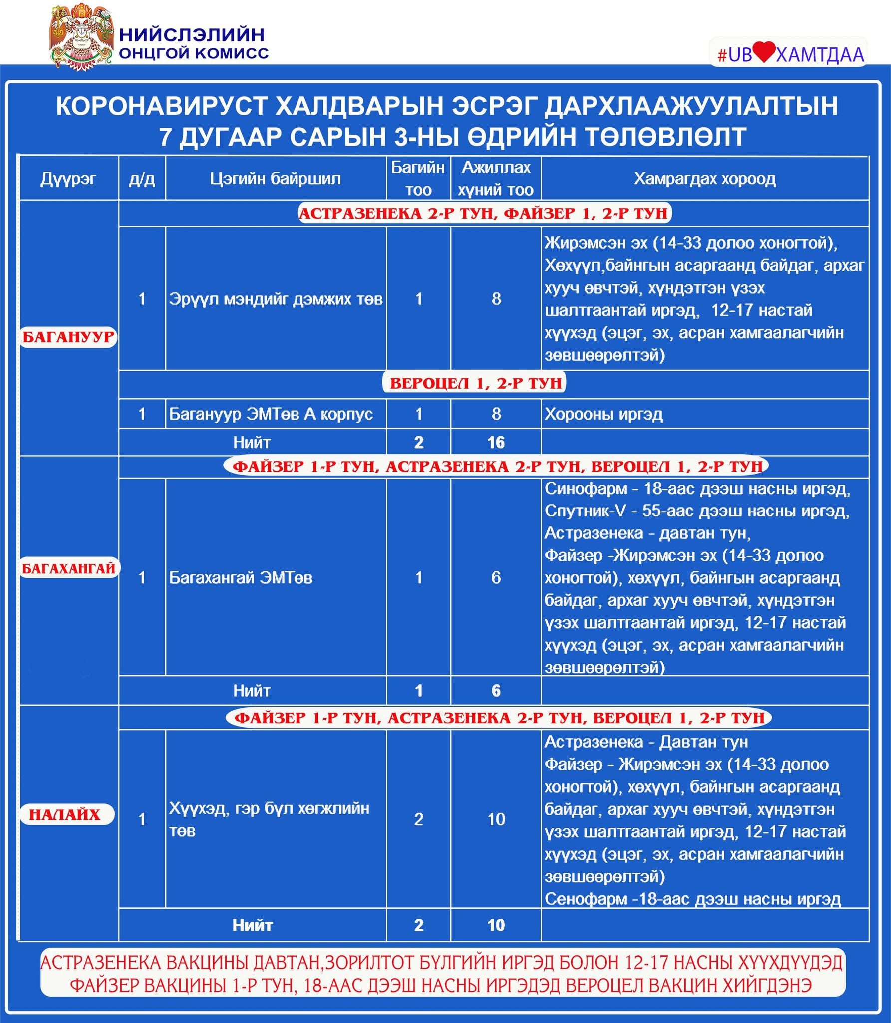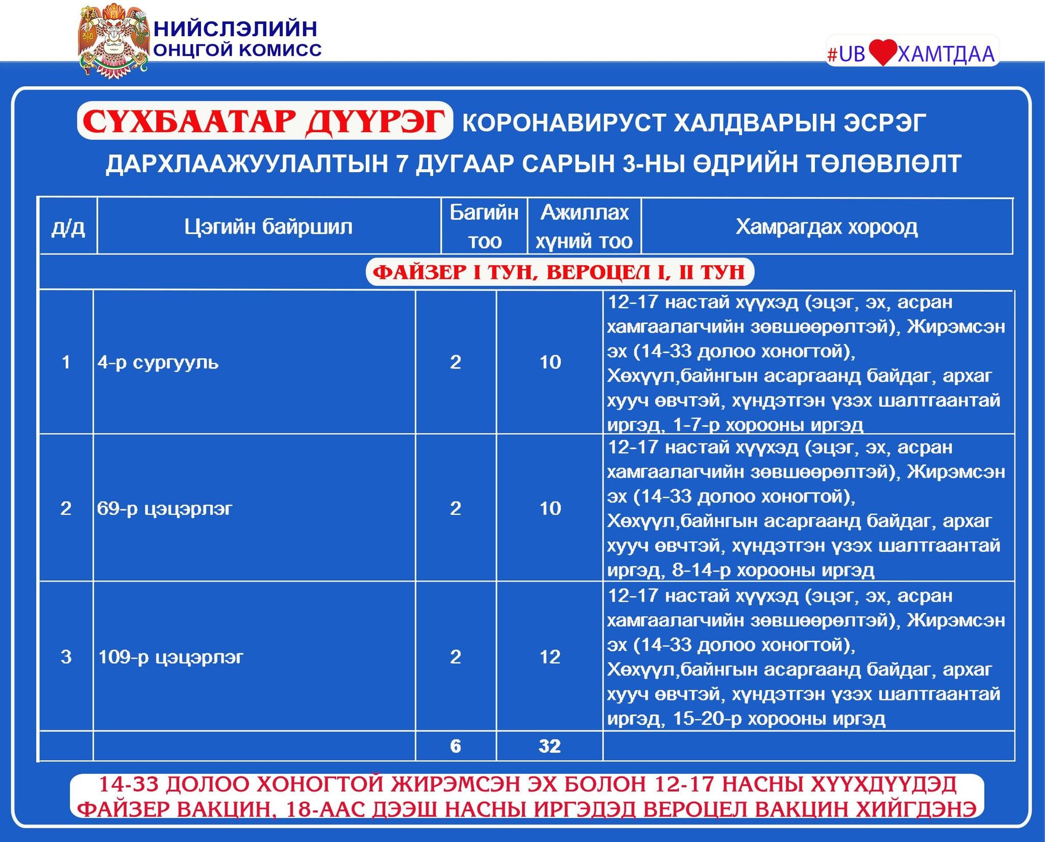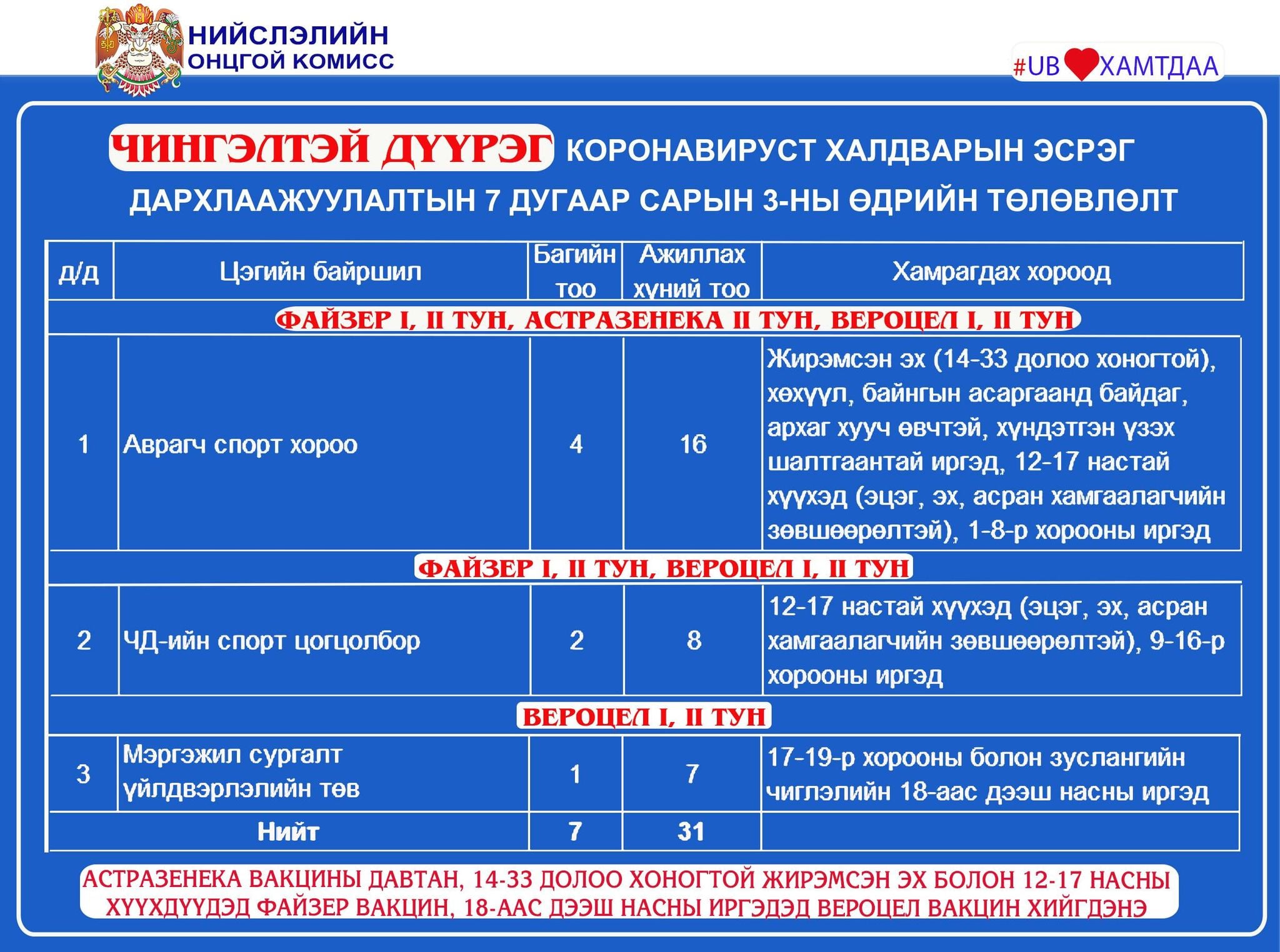 Улаанбаатар хотод өнөөөдөр буюу долдугаар сарын 3-нд коронавирусийн эсрэг дархлаажуулалтын суурин 25 цэгт 40 багийн 288 эмч, ажилтан ажиллаж, 14215 иргэнийг дархлаажуулна.