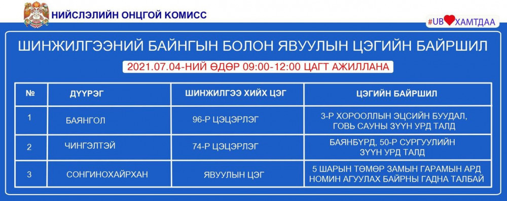 Өнөөдөр коронавирусийн шинжилгээ авах цэгүүдийн байршлыг хүргэж байна. Тодруулбал,