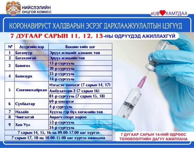 Долдугаар сарын 14-16-ны өдрүүдэд дархлаажуулалтын цэгүүд тогтсон цагийн хуваарийн дагуу буюу 09:00-17:00 цагт ажиллана. Харин 17, 18-нд 10:00-15:00 цагийн хооронд ажиллах хуваарь гарчээ.