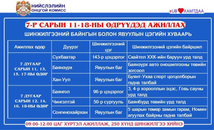 Долдугаар сарын 12, 14, 16, 18-нд Баянгол, Чингэлтэй, Сонгинохайрхан дүүргийн шинжилгээний цэгүүд ажиллана.