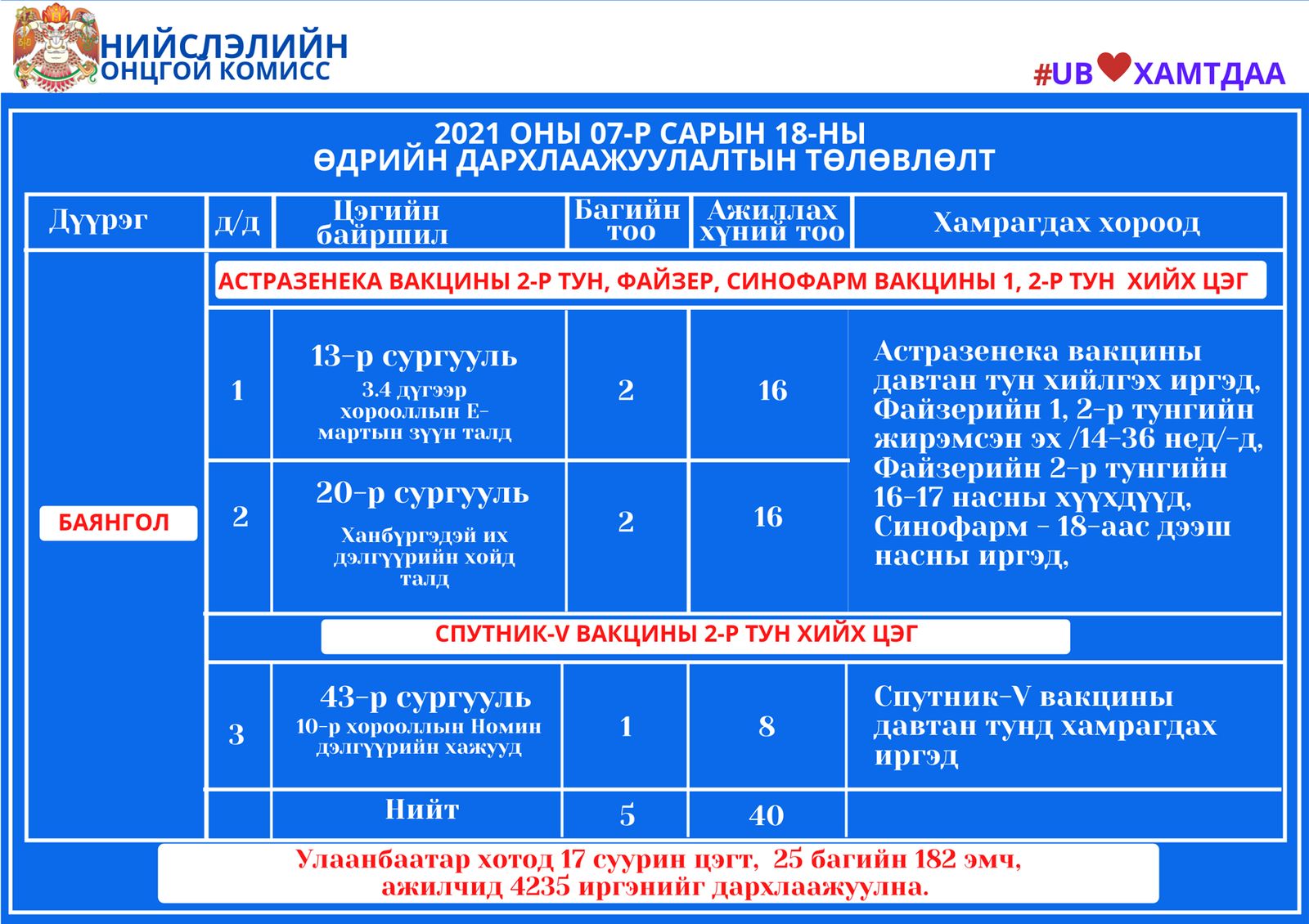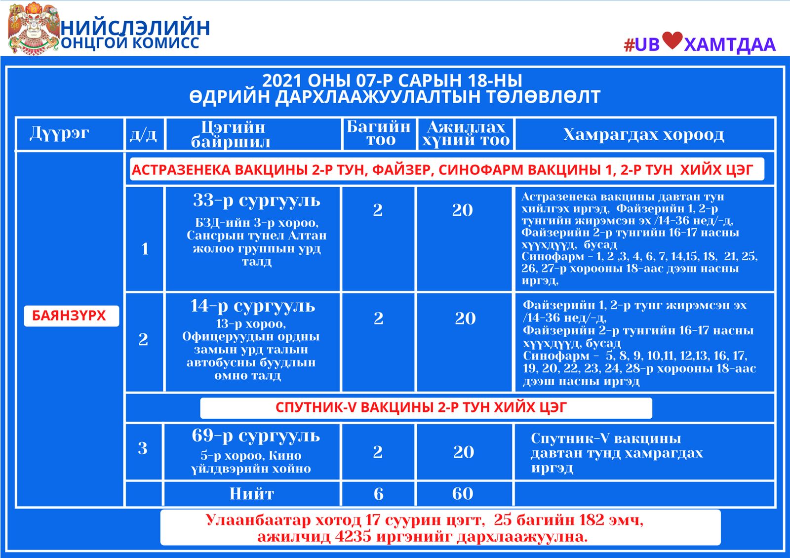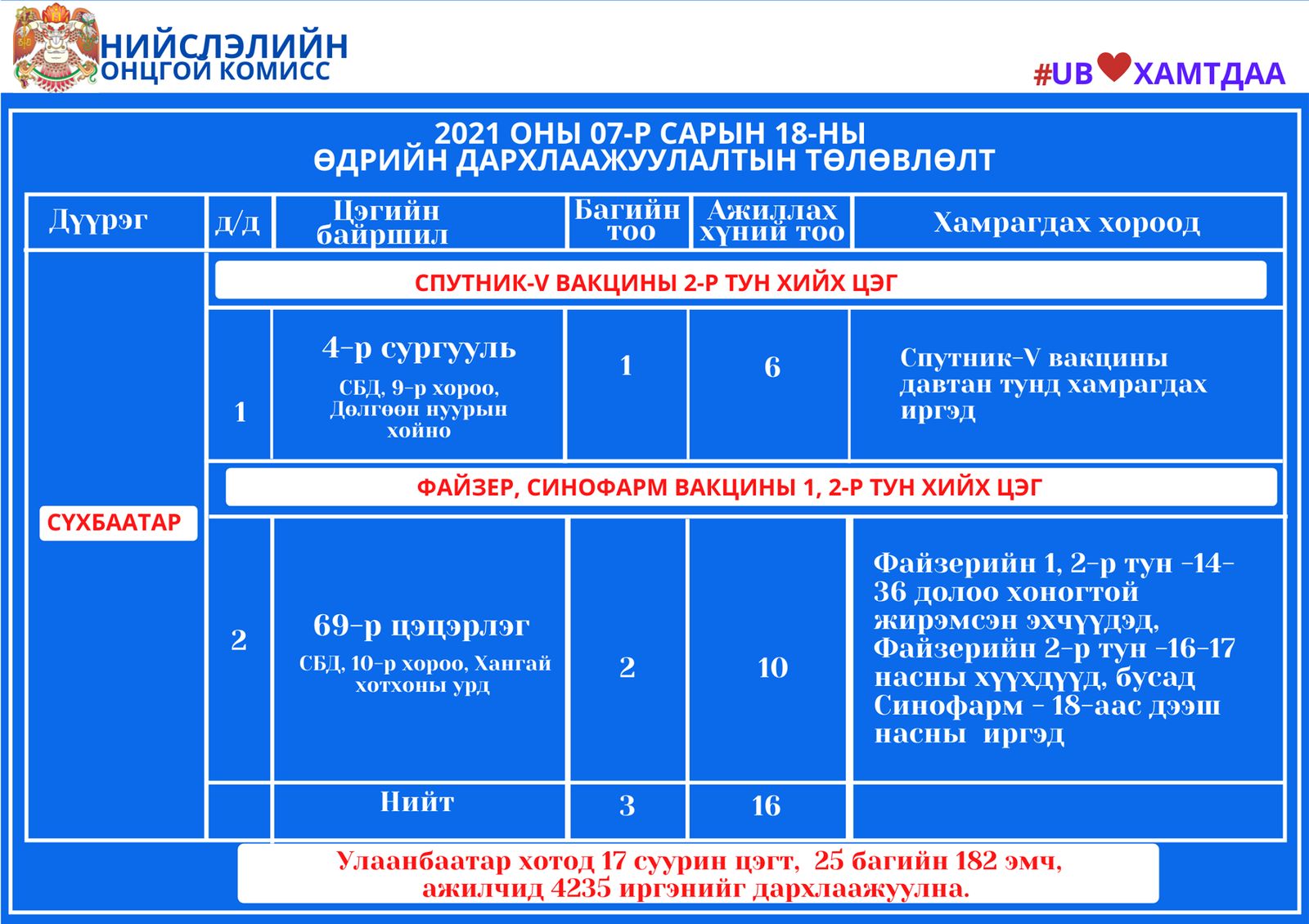 Улаанбаатар хотод өнөөдөр суурин 17 цэгт 25 багийн 182 эмч, ажилтан ажиллаж 4235 иргэнийг вакцинжуулалтад хамруулахаар төлөвлөжээ. Өнөөдөр дархлаажуулалтын цэгүүд 10:00-15:00 цагийн хооронд ажиллана.