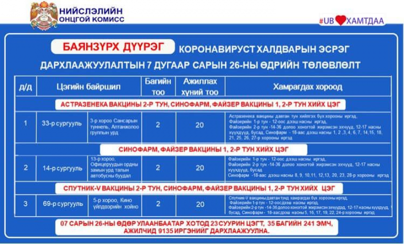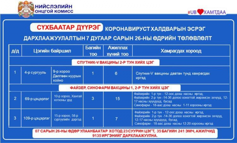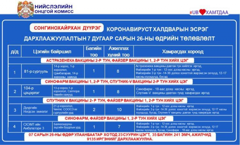 Улаанбаатар хотод өнөөдөр суурин 23 цэгт 35 багийн 241 эмч, ажилтан ажиллаж, синофарм, спутник-в, файзер вакциныг 9135 иргэнд тарихаар төлөвлөжээ. Дархлаажуулалтын цэгүүд 09:00-17:00 цаг хүртэл ажиллана.